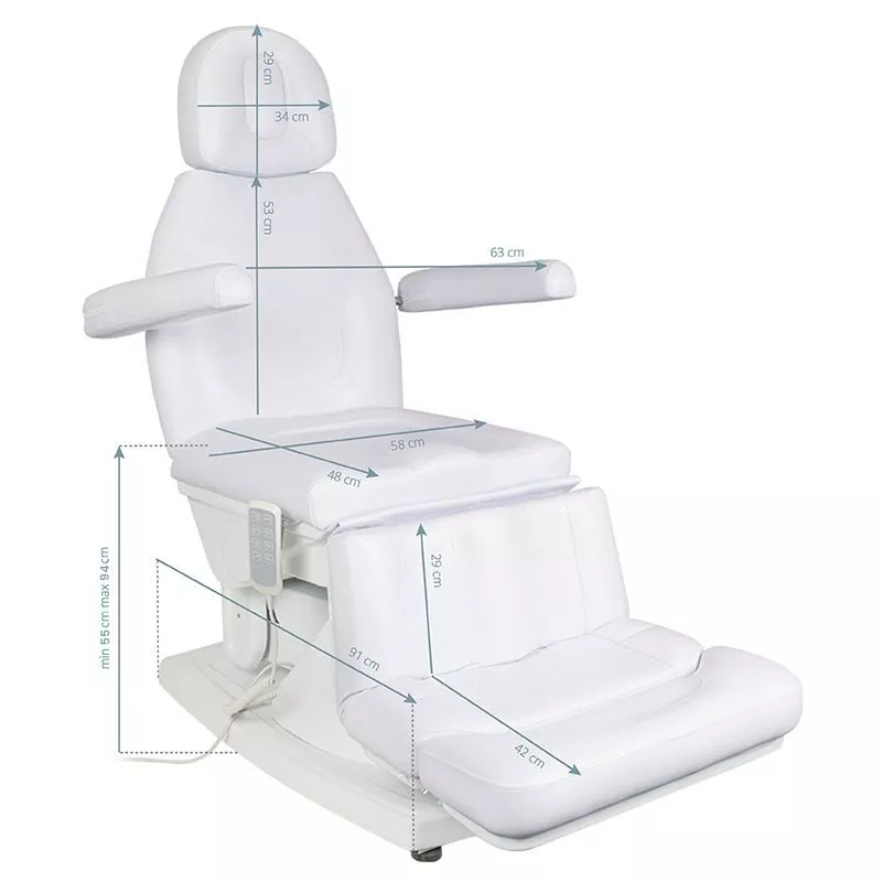 Fotel można wygodnie regulować za pomocą intuicyjnego pilota przewodowego, który umożliwia płynne sterowanie w czterech płaszczyznach: wysokości, nachylenia oparcia, kołyski oraz podnóżka. Zakres regulacji wysokości siedziska wynosi od 55 cm do 94 cm, co pozwala na dopasowanie ustawienia do wzrostu specjalisty oraz rodzaju wykonywanego zabiegu. W pełnym rozłożeniu fotel osiąga długość ponad 200 cm, dzięki czemu zapewnia komfort użytkownikom o różnym wzroście. Dla większej wygody pilot można odwiesić na uchwycie przy siedzisku, co zapobiega jego przeszkadzaniu w trakcie pracy. Opcjonalnie dostępna jest możliwość podłączenia przełącznika nożnego (kod 133026).