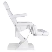 Wygodne ergonomicznie wyprofilowane siedzisko zapewnia wygodne i stabilne ułożenie ciała podczas zabiegów. Konstrukcja umożliwia rozłożenie fotela do pozycji leżanki, a praktyczny otwór w zagłówku, dyskretnie ukryty pod poduszką, sprawia, że doskonale sprawdza się również przy masażach oraz zabiegach na plecy i ciało. Wysuwany zagłówek pozwala dodatkowo dopasować fotel do wzrostu klienta i rodzaju wykonywanego zabiegu. Stabilne podłokietniki zapewniają komfortowe podparcie rąk, a możliwość ich odchylenia do tyłu ułatwia zajmowanie miejsca na fotelu.