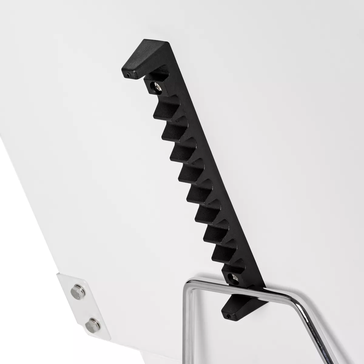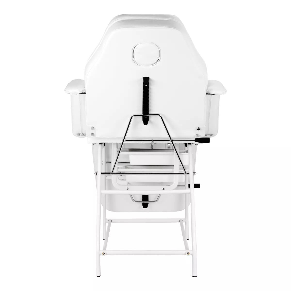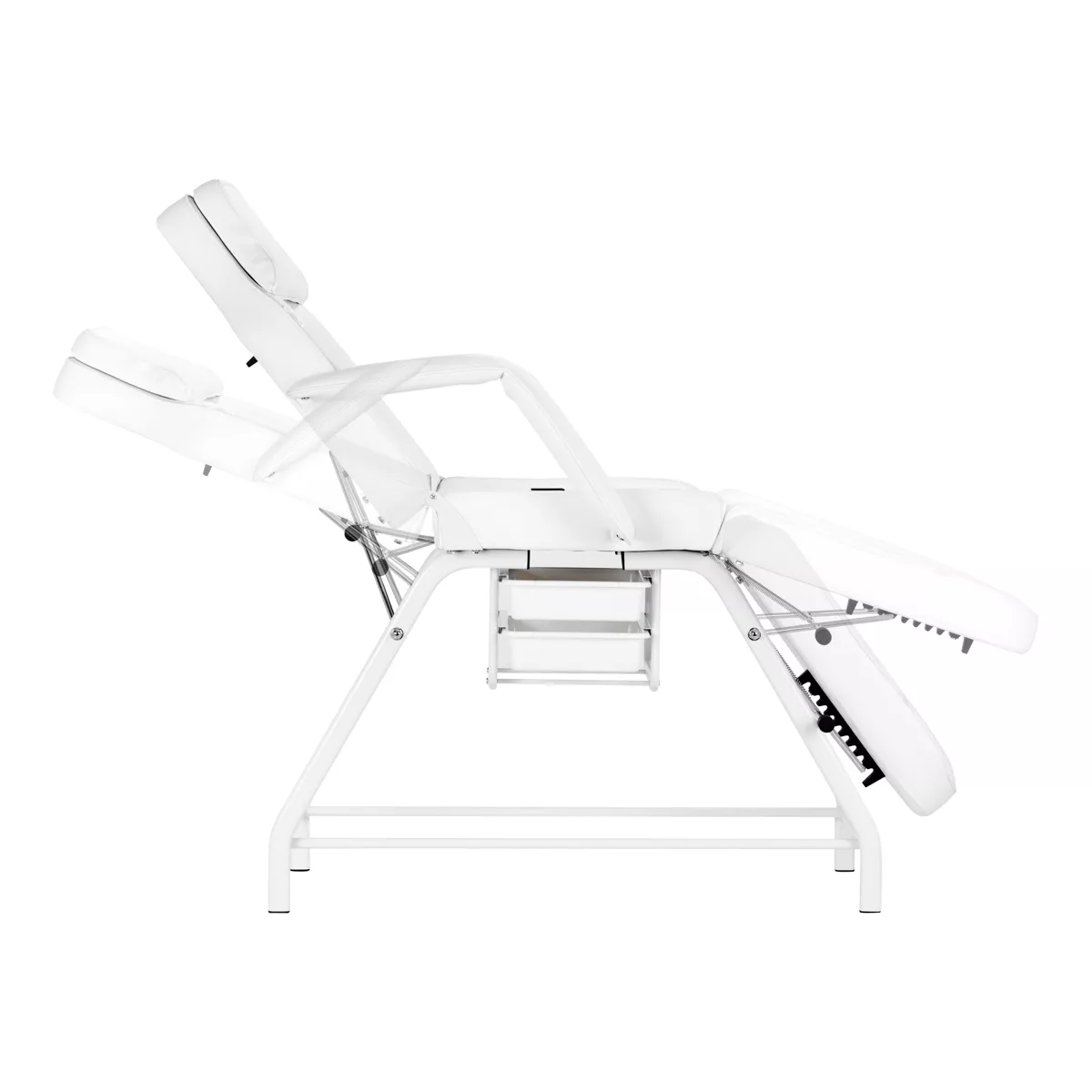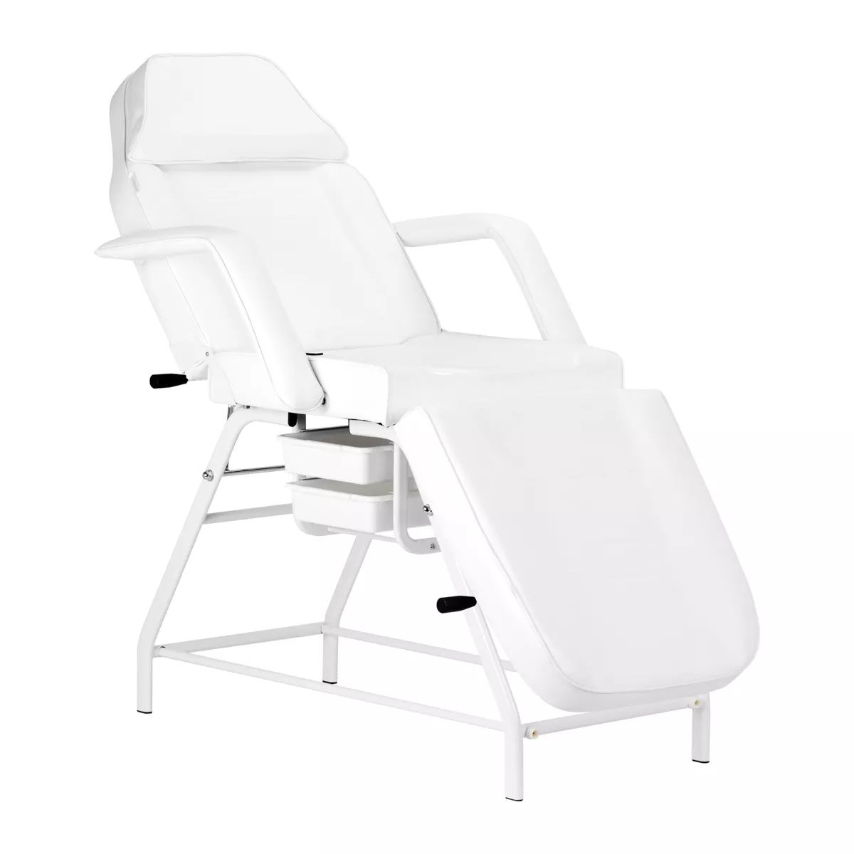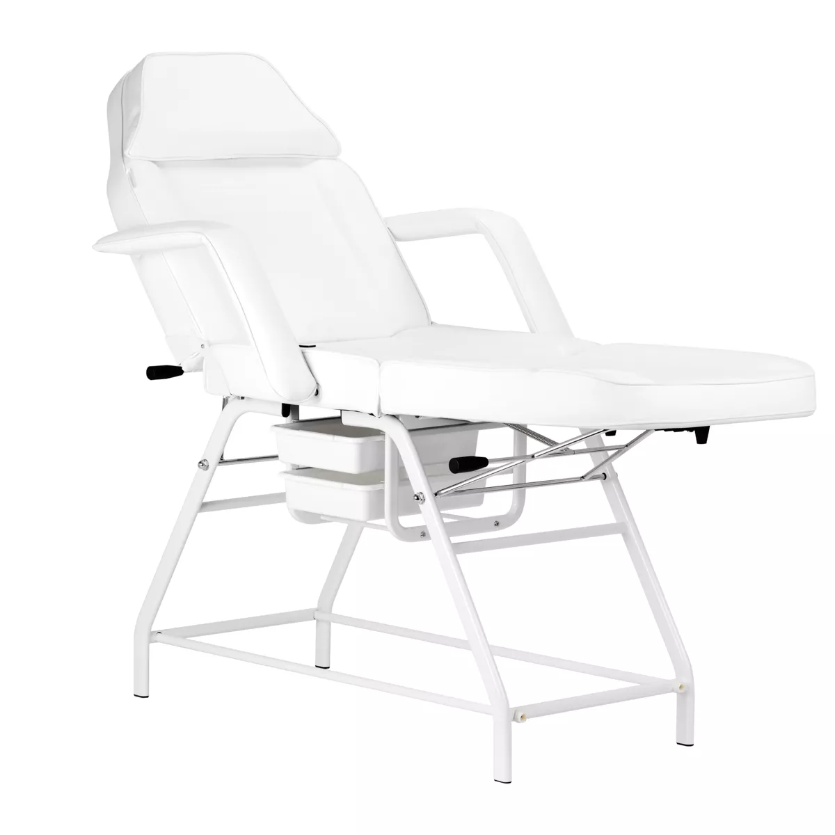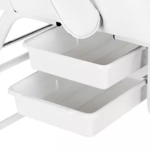 Praktyczne kuwety z tworzywa sztucznego umieszczone pod siedziskiem zapewniają łatwy dostęp do najpotrzebniejszych przyrządów. Wysuwane pojemniki są trwałe i łatwe w czyszczeniu, a dodatkowo pomagają utrzymać porządek na stanowisku pracy. Dzięki otworowi w zagłówku, który jest ukryty pod odpowiednio wyprofilowaną poduszką, fotel doskonale sprawdzi się przy zabiegach przeprowadzanych na plecach, takich jak masaże.