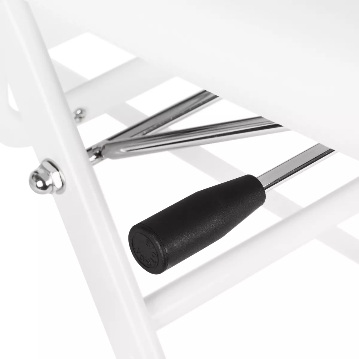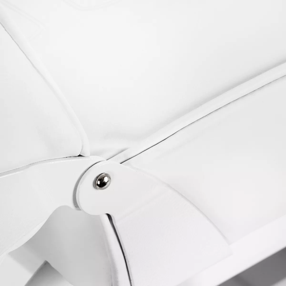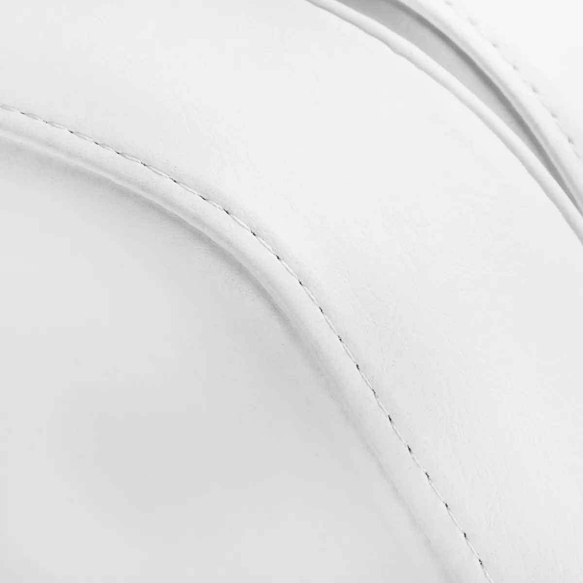 Metalowy stelaż dzięki półmatowemu wykończeniu oraz opływowo wyprofilowanym nóżkom wygląda elegancko i nie przytłacza przestrzeni. Podstawa fotela nie umożliwia regulacji wysokości siedziska, jednak znajduje się ono na wysokości, które powinna być komfortowa w trakcie użytkowania. Fotel wypełniony jest pianką i pokryty imitacją skóry w odcieniach bieli. Dzięki użyciu takiego materiału, sprzęt jest komfortowy w użytkowaniu, odporny na wilgoć oraz łatwy w czyszczeniu. Odpowiednio wyprofilowane obszycia nadają ergonomiczny kształt siedzisku. Prosty design i klasyczna kolorystyka pozwalają mu wpasować się w każde wnętrze.