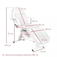 Specjalny mechanizm zapewnia stopniową regulację kątów podnóżka i oparcia. Przy użyciu dźwigni można swobodnie dostosowywać ustawienie fotela. Pozwala to na optymalne dopasowanie do indywidualnych potrzeb, dla prawidłowego i wygodnego wykonywania zabiegów oraz wysokiego komfortu użytkowania. Fotel można rozłożyć do pozycji leżanki, co znacząco zwiększa jego funkcjonalność. Pozwala to swobodnie wykonywać różnego rodzaju zabiegi między innymi z zakresu kosmetyki, fizjoterapii czy tatuażu.