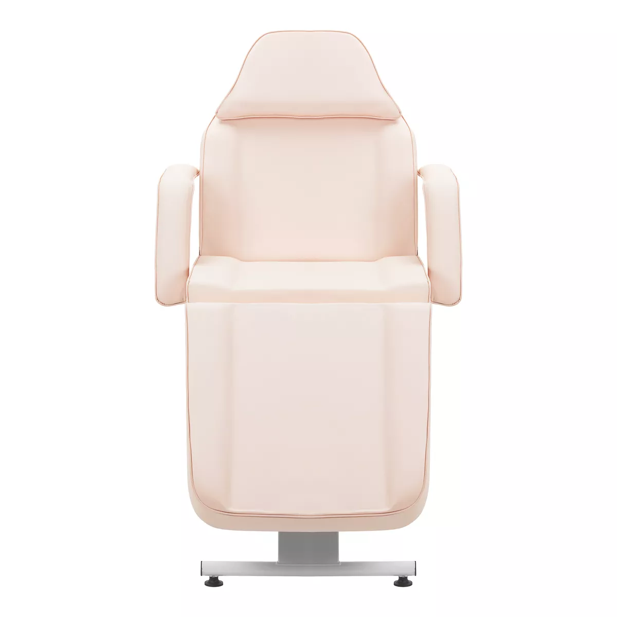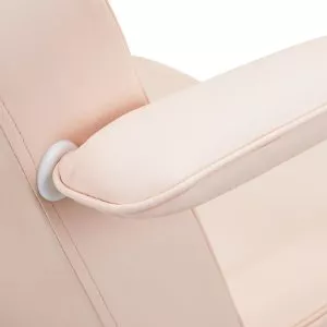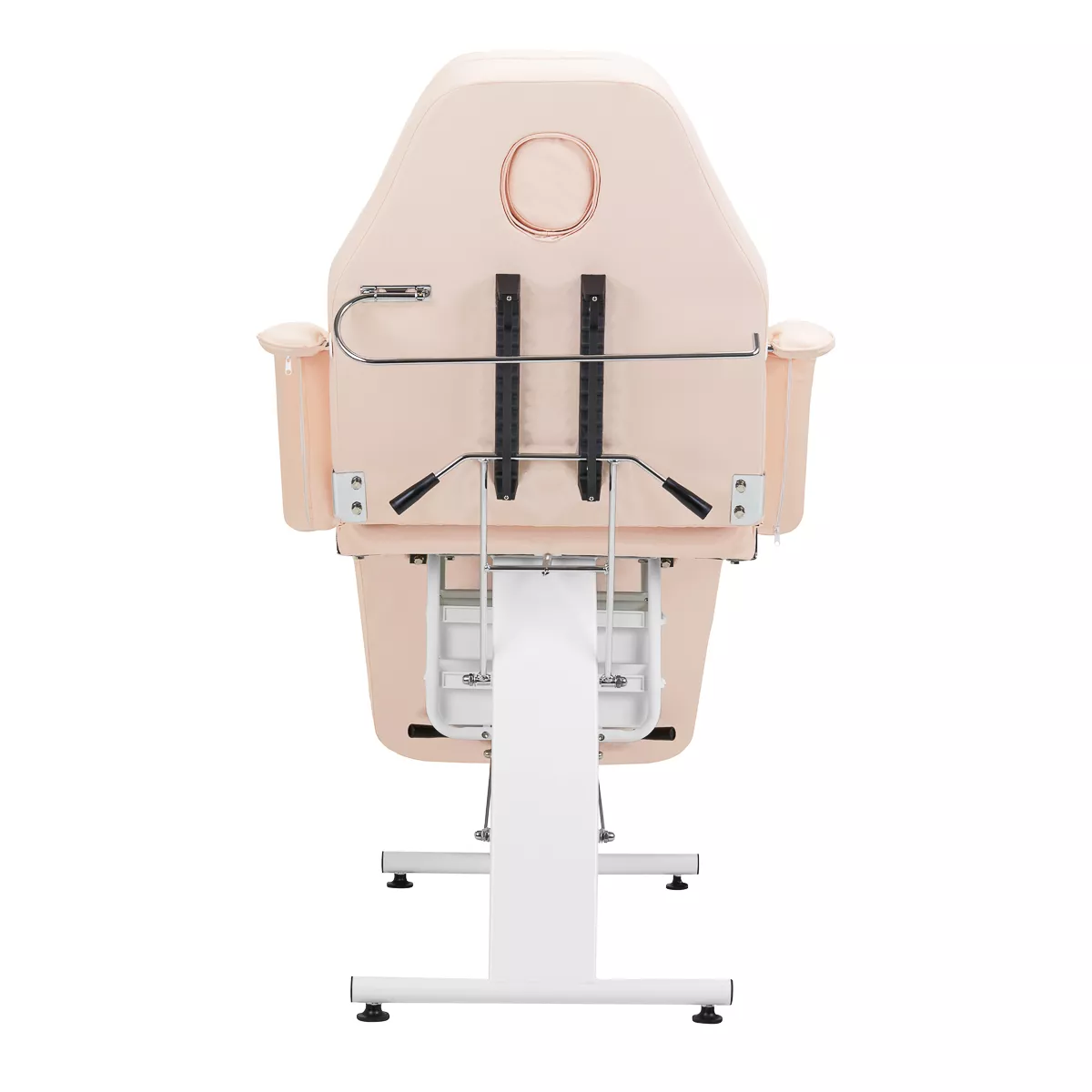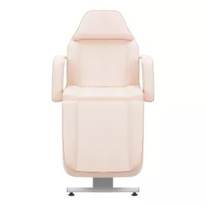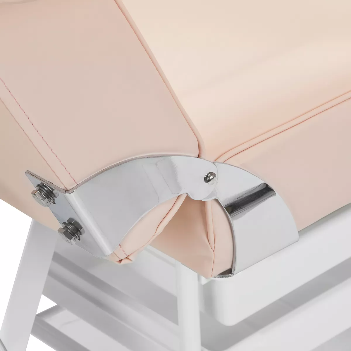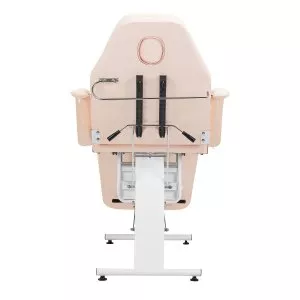 Stabilne, miękkie podłokietniki gwarantują użytkownikowi odpowiednie podparcie. Elementy te, dzielone w połowie, są ruchome, dlatego dobrze układają się przy zmianach pozycji oparcia, a dodatkowo mogą być w łatwy sposób zdjęte. Ukryty pod odpowiednio wyprofilowaną poduszką otwór w zagłówku sprawia, że fotel doskonale sprawdza się zarówno podczas zabiegów na twarz, jak i tych przeprowadzanych na plecach.