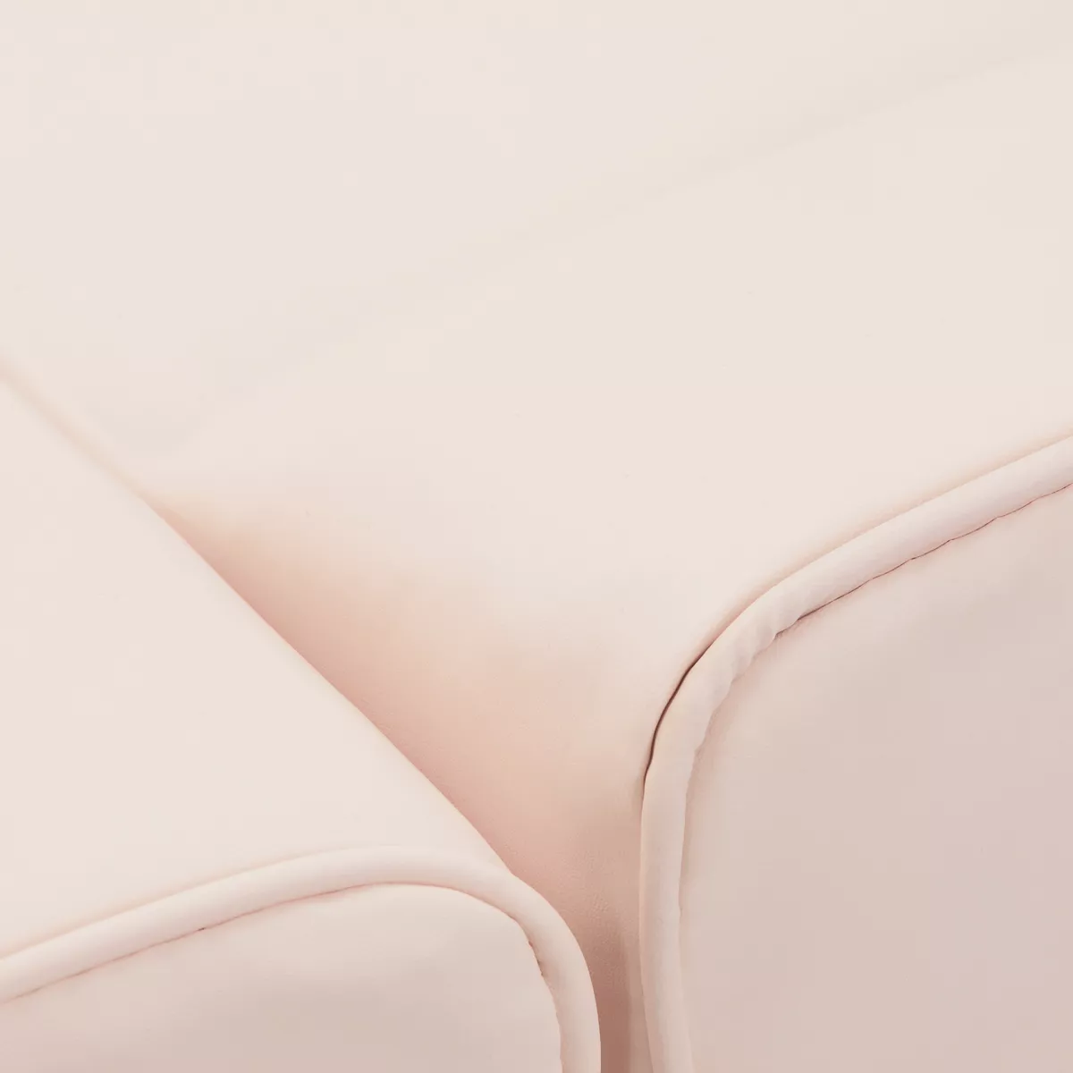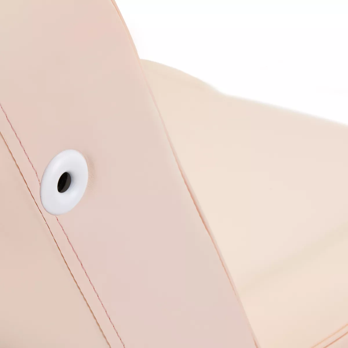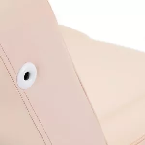 Podstawa fotela posiada stałą wysokość, w związku z czym siedzisko znajduje się na niezmiennym poziomie, który powinien zapewnić komfort w trakcie użytkowania. Solidny metalowy stelaż w odcieniach bieli oraz antypoślizgowe stopki zapewniają niezbędną w trakcie użytkowania stabilność. Fotel wypełniony jest pianką i pokryty imitacją skóry w odcieniach różu. Dzięki użyciu takiego materiału, sprzęt jest komfortowy w użytkowaniu, odporny na wilgoć oraz łatwy w czyszczeniu. Odpowiednio wyprofilowane obszycia nadają ergonomiczny kształt siedzisku. Prosty design oraz elegancka kolorystyka ułatwiają mu wpasowanie się w każde wnętrze.