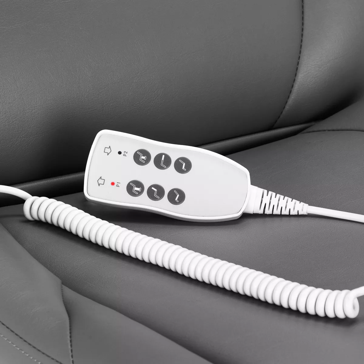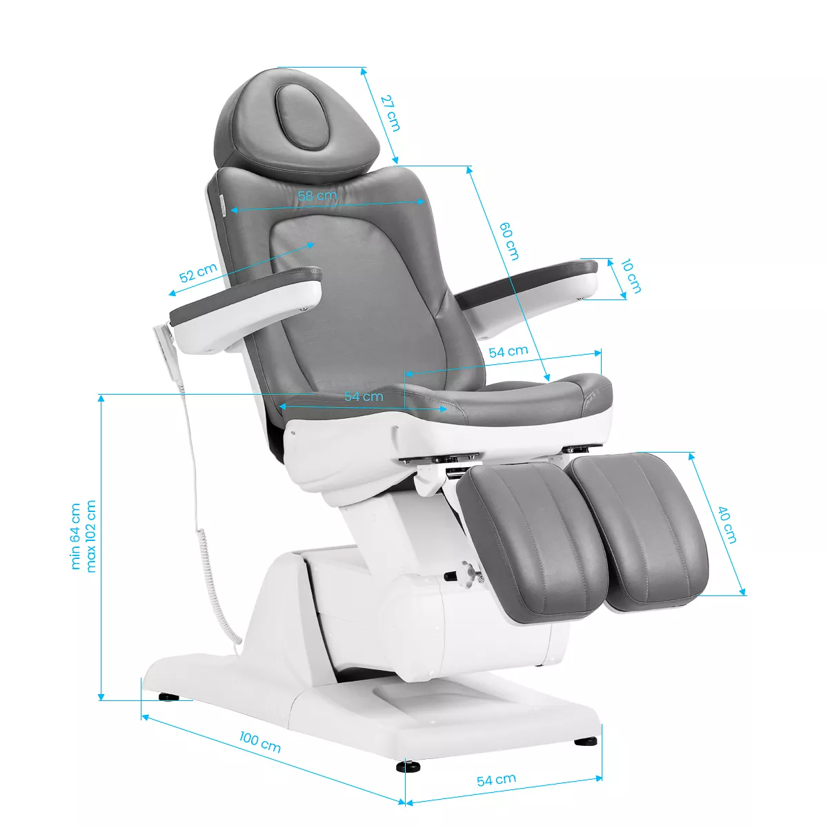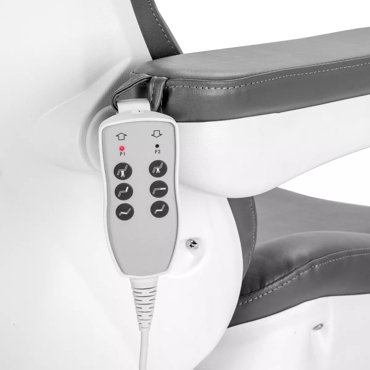 Regulacja elektryczna: Trzy ciche silniki elektryczne umożliwiają szybkie i wygodne dostosowanie pozycji fotela do potrzeb zabiegu.