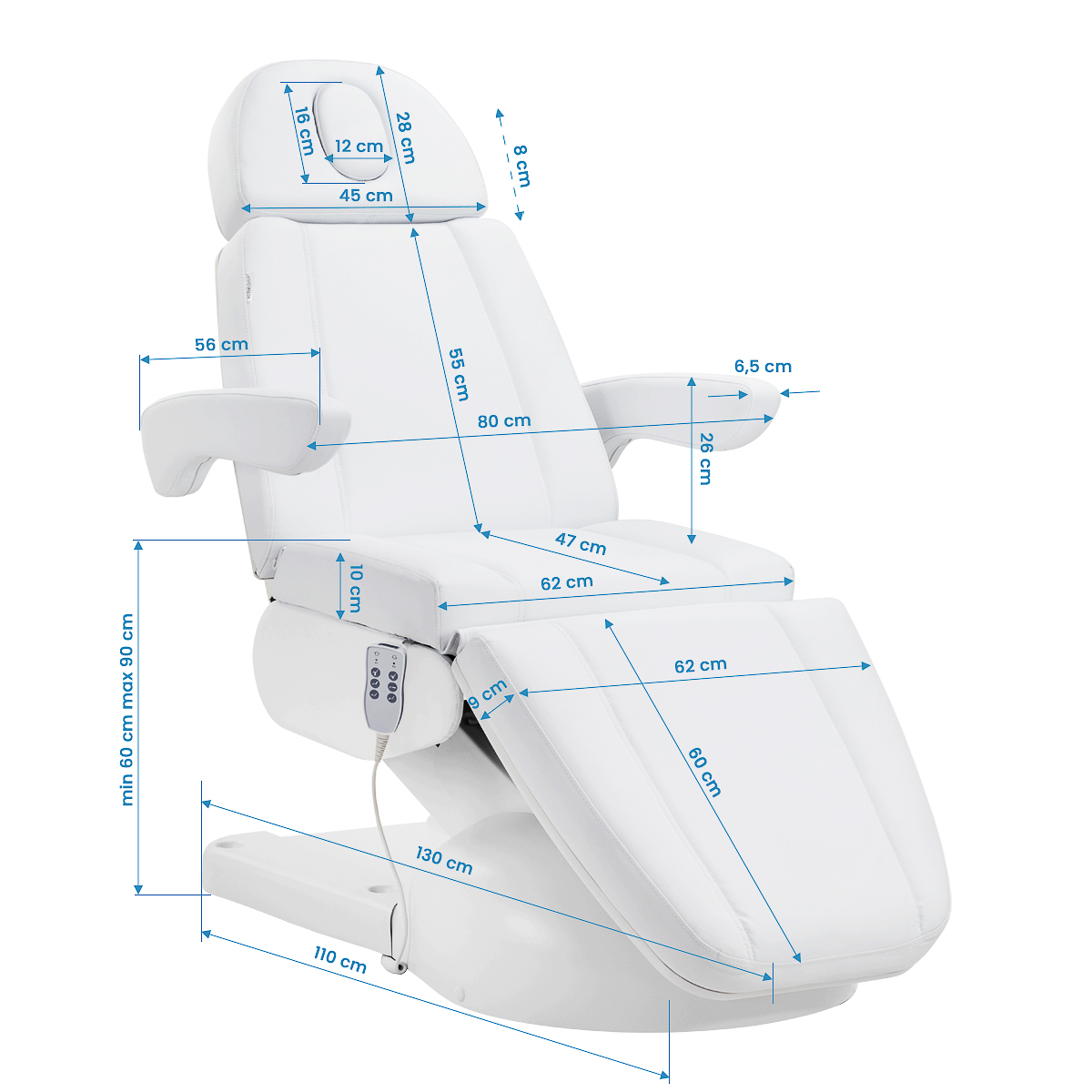 Wygodne sterowanie za pomocą pilota przewodowego pozwala na precyzyjne ustawienie fotela w trzech płaszczyznach: regulacji wysokości, kąta nachylenia oparcia oraz ustawienia podnóżka. Tak zakres regulacji umożliwia dopasowanie pozycji do rodzaju wykonywanego zabiegu – zarówno pod względem komfortu klienta, jak i ergonomii pracy specjalisty. Dla wygody użytkowania pilot można zawiesić na uchwytach umieszczonych po obu stronach siedziska.