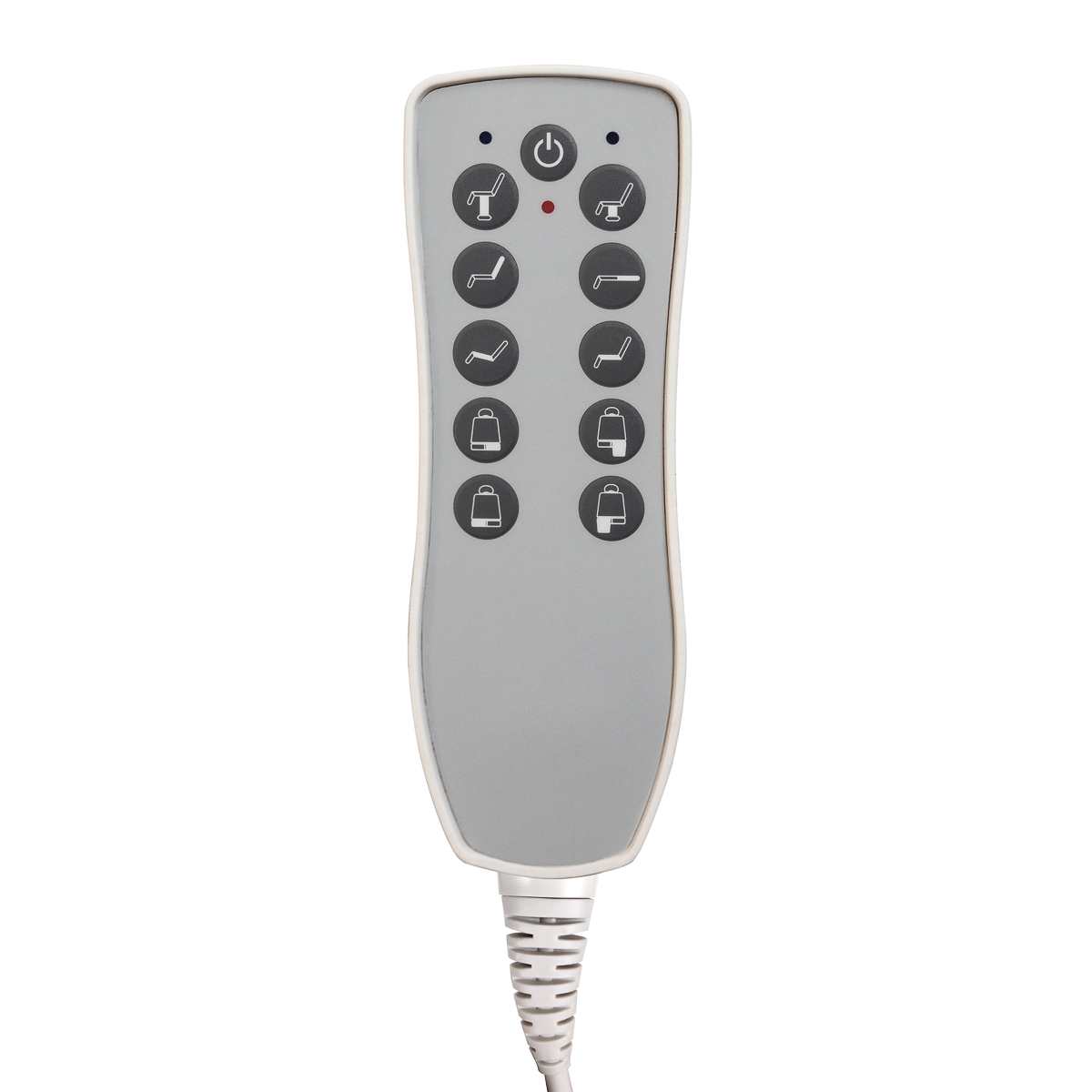 Sterowanie za pomocą pilota przewodowego pozwala na precyzyjne ustawienie fotela w pięciu płaszczyznach: regulacji wysokości, kąta nachylenia oparcia, ustawienia obu części podnóżka oraz kołyski. Taki zakres regulacji umożliwia dopasowanie pozycji do rodzaju wykonywanego zabiegu – zarówno pod względem komfortu klienta, jak i ergonomii pracy specjalisty. Dla wygody użytkowania pilot można zawiesić na uchwytach umieszczonych po obu stronach siedziska.