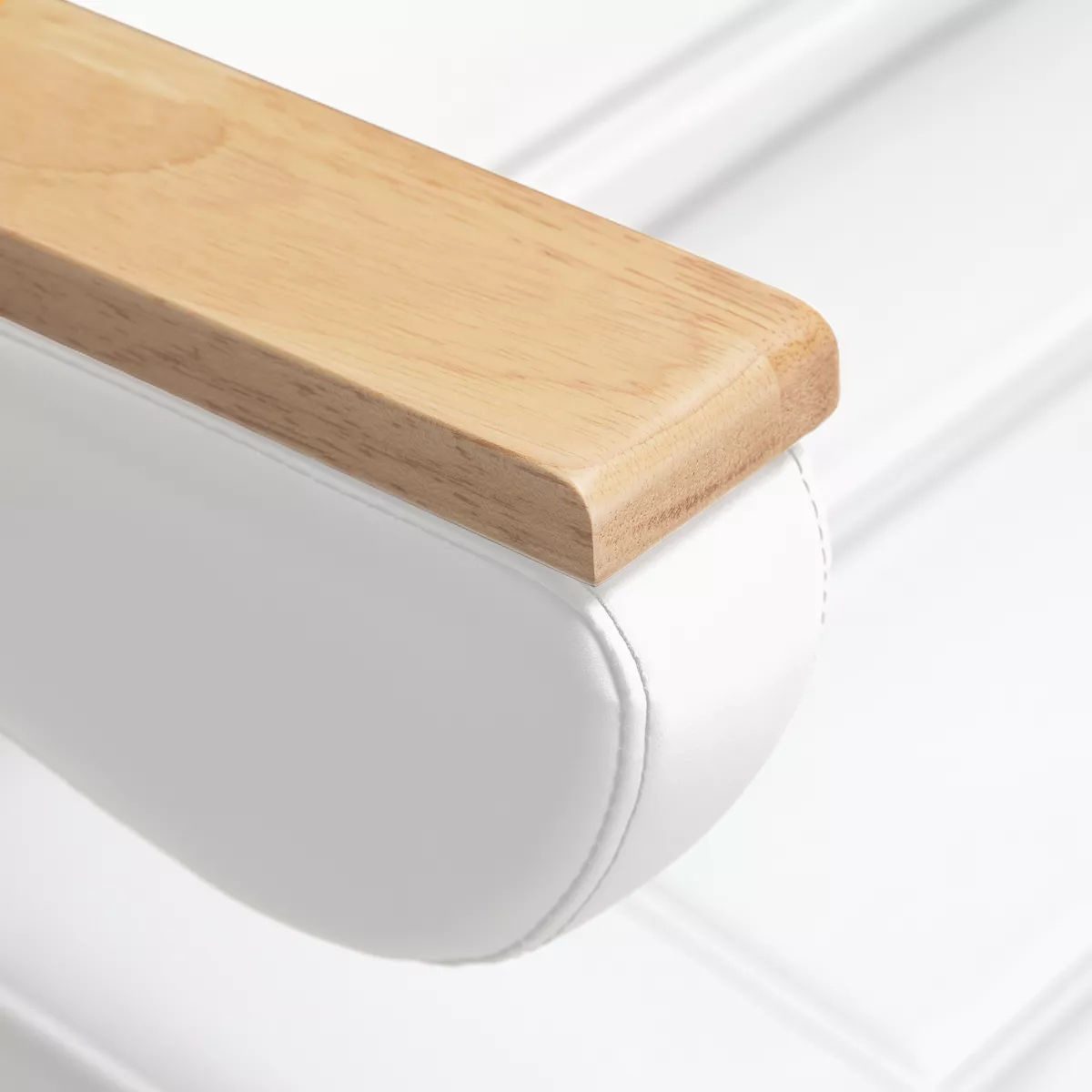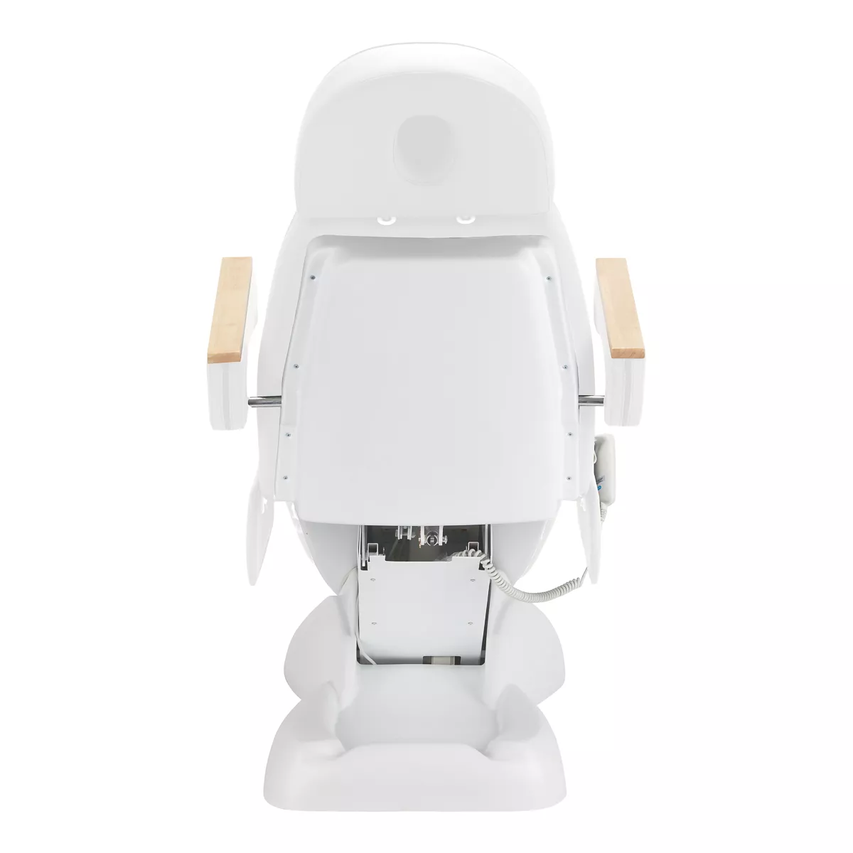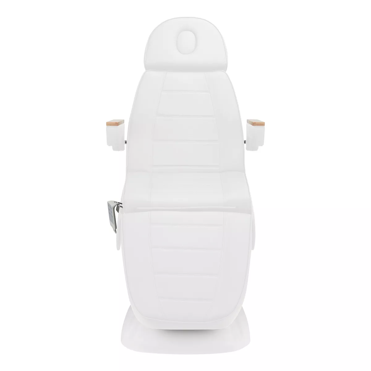 Fotel wypełniony jest pianką o odpowiedniej twardości oraz pokryty przyjemną w dotyku imitacją skóry w odcieniach bieli. Dzięki użyciu materiału, który jest łatwy do utrzymania w czystości oraz odporny na wybrane środki dezynfekcji, sprzęt jest komfortowy w użytkowaniu, wytrzymały na wilgoć oraz nieskomplikowany w czyszczeniu. Solidna podstawa wykonana z trwałego materiału w odcieniach bielizapewnia stabilność w trakcie zabiegów. Ozdobne drewniane elementy na podłokietnikach wyróżniają fotel pośród innych modeli, stanowiąc atrakcyjny wizualnie, elegancki akcent. Odpowiednio wyprofilowane obszycia nadają fotelowi stylowy wygląd i sprawiają, że siedzisko jest ergonomiczne.