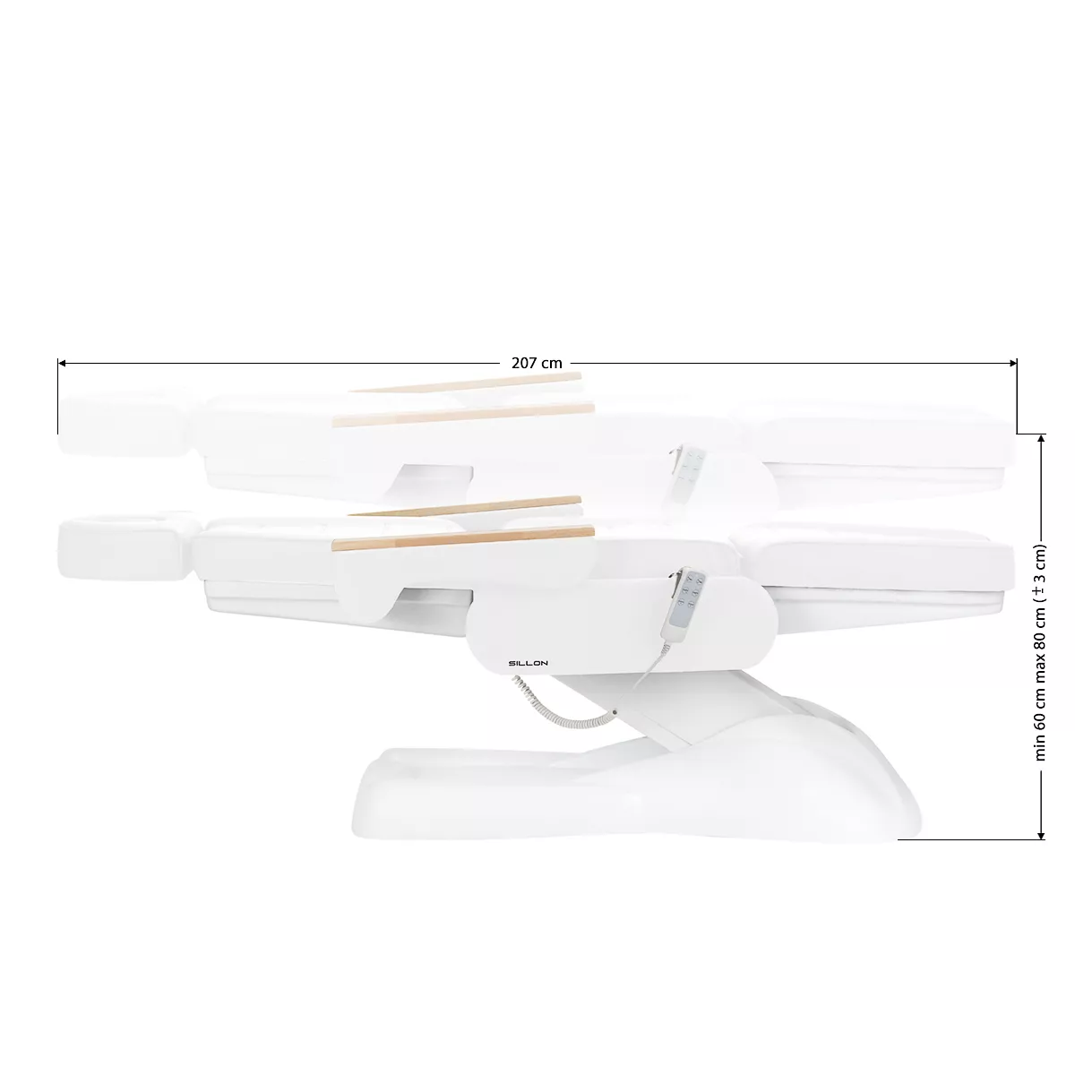 Wysokość siedziska regulowana jest w zakresie od 60 cm do 80 cm (± 3 cm), a przy całkowitym rozłożeniu fotel osiąga długość ponad 2 metrów. Wymiary te pozwalają na łatwe korzystanie ze sprzętu osobom o różnym wzroście i umożliwiają dostosowanie go do potrzeb zarówno klienta, jak i osoby wykonującej zabieg. Po prawej stronie siedziska zamontowano specjalny metalowy uchwyt do wieszania pilota, co znacznie ułatwia jego przechowywanie i sprawia, że zawsze znajduje się pod ręką.