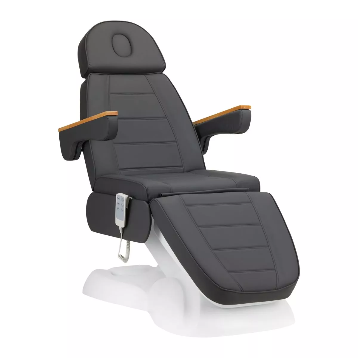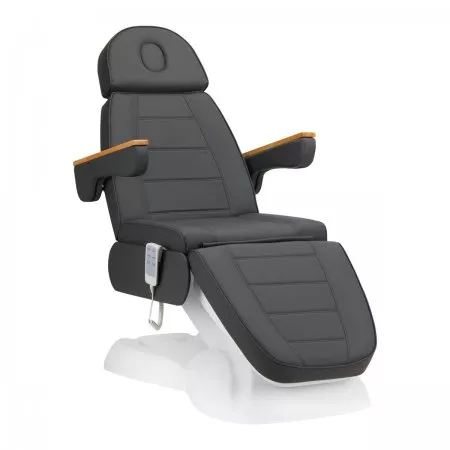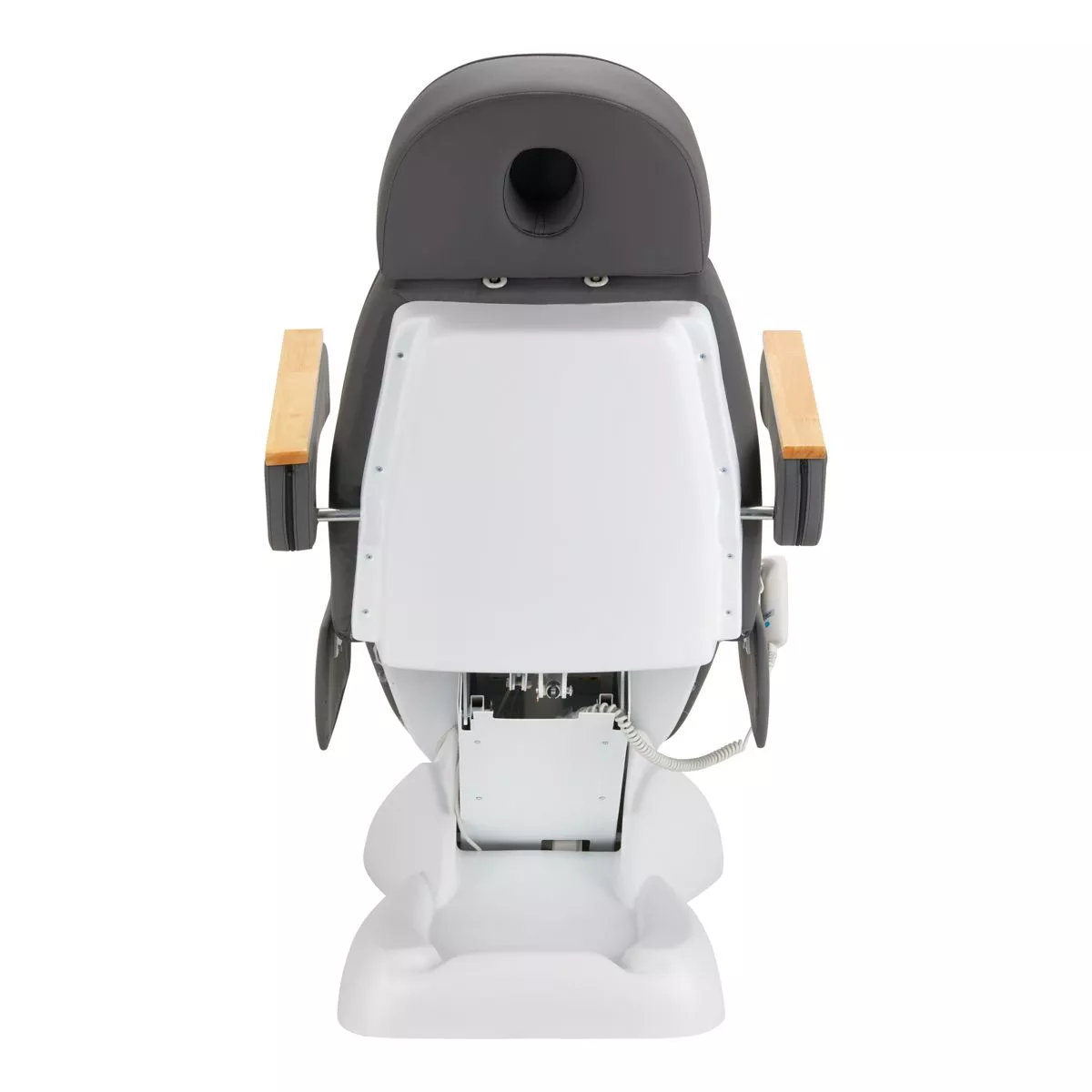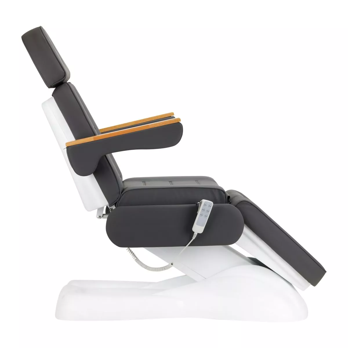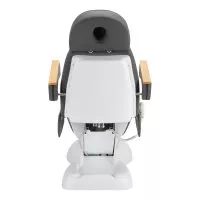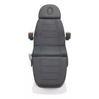 Fotel wypełniony jest pianką o odpowiedniej twardości oraz pokryty przyjemną w dotyku imitacją skóry w odcieniach szarości. Dzięki użyciu materiału, który jest łatwy do utrzymania w czystości oraz odporny na wybrane środki dezynfekcji, sprzęt jest komfortowy w użytkowaniu, wytrzymały na wilgoć oraz nieskomplikowany w czyszczeniu. Solidna podstawa wykonana z trwałego materiału w odcieniach bieli zapewnia stabilność w trakcie zabiegów. Ozdobne drewniane elementy na podłokietnikach wyróżniają fotel pośród innych modeli, stanowiąc atrakcyjny wizualnie, elegancki akcent. Odpowiednio wyprofilowane obszycia nadają fotelowi stylowy wygląd i sprawiają, że siedzisko jest ergonomiczne.