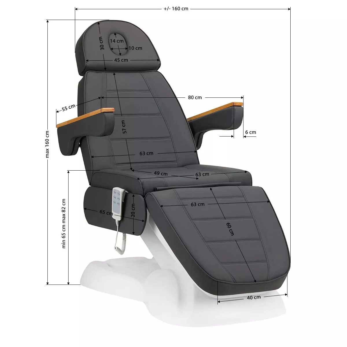Wysokość siedziska regulowana jest w zakresie od 65 cm do 84 cm, a przy całkowitym rozłożeniu fotel osiąga długość ponad 2 metrów. Wymiary te pozwalają na łatwe korzystanie ze sprzętu osobom o różnym wzroście i umożliwiają dostosowanie go do potrzeb zarówno klienta, jak i osoby wykonującej zabieg. Po prawej stronie siedziska zamontowano specjalny metalowy uchwyt do wieszania pilota, co znacznie ułatwia jego przechowywanie i sprawia, że zawsze znajduje się pod ręką.