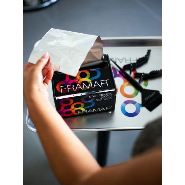Framar Star Struck Silver to gładka, srebrna folia aluminiowa klasy premium, stworzona specjalnie z myślą o profesjonalnej koloryzacji. Miękka, elastyczna, doskonale przylega do włosów i nie ślizga się podczas aplikacji. Nie ma nic wspólnego z folią spożywczą – to narzędzie pracy profesjonalisty :)