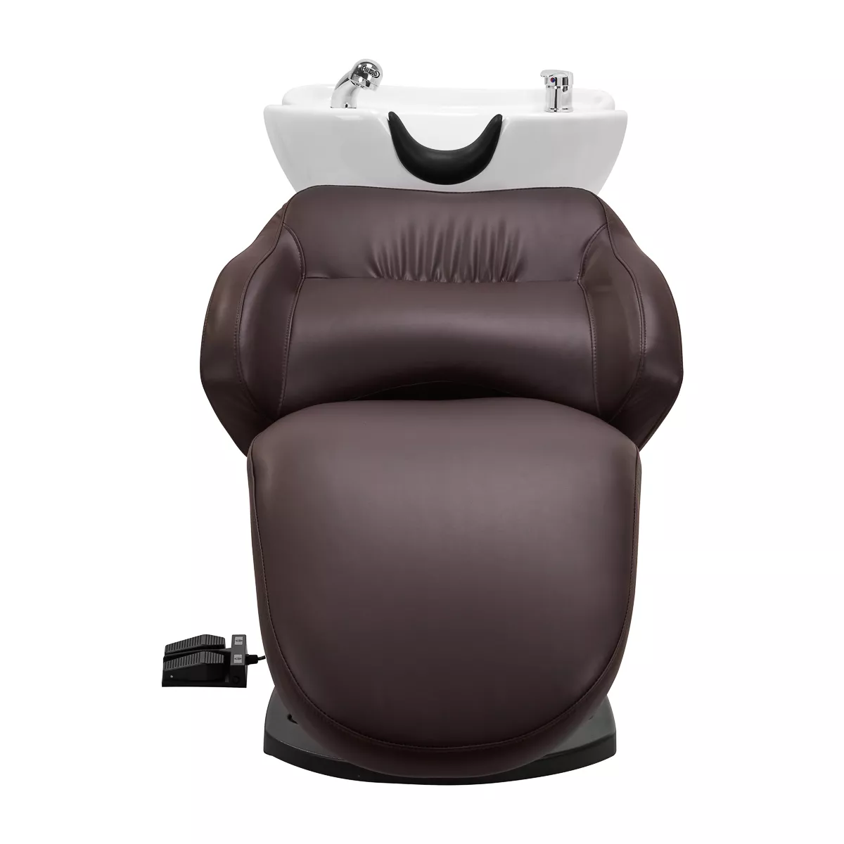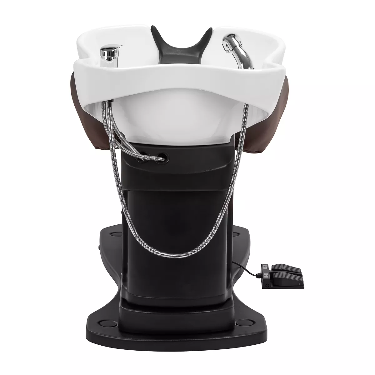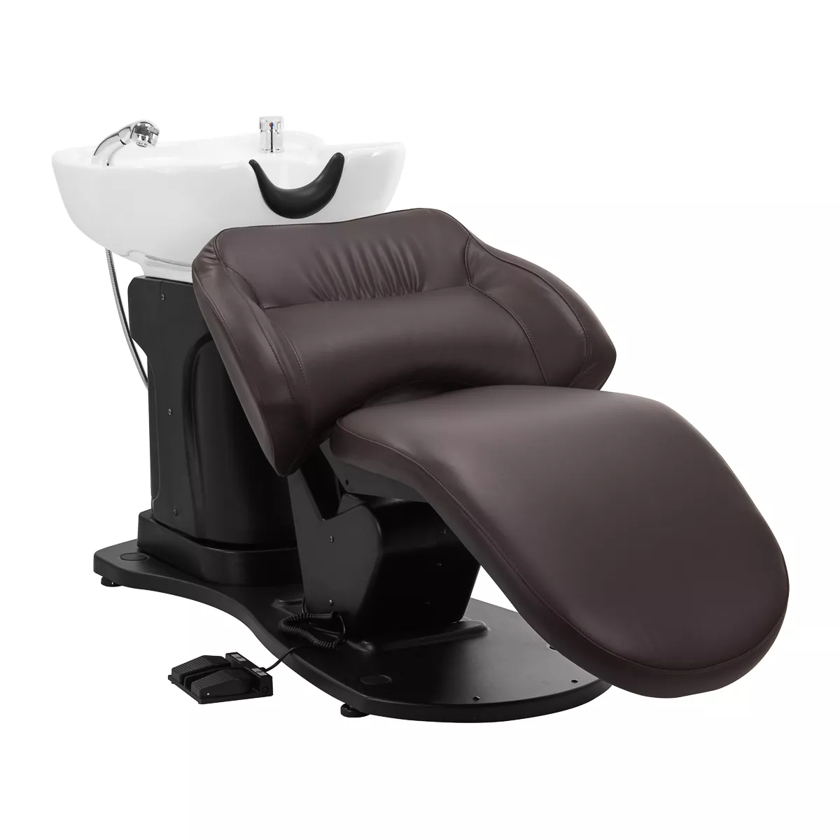 Głębokość ceramicznej misy umywalki w odcieniach bieli pozwala na komfortowe i efektywne wykonywanie szerokiej gamy usług fryzjerskich, zapobiegając nadmiernemu rozchlapywaniu wody oraz używanych w trakcie zabiegu produktów. Zastosowany materiał sprawia, że umywalka jest wytrzymała, odporna na przebarwienia i zadrapania oraz bardzo łatwa do utrzymania w czystości. Odpowiednio wyprofilowany kołnierz zapewnia wygodę w trakcie mycia włosów. Zastosowanie w misie specjalnej podpórki gwarantuje odpowiednie podparcie głowy, dzięki czemu jej ciężar nie spoczywa na szyi. Innowacyjne rozwiązanie zapobiega napięciom i dyskomfortowi w obrębie karku i zapewnia wysoki komfort, nawet w trakcie wykonywania długich zabiegów. Dodatkowo dzięki komfortowej nakładce z tworzywa sztucznego w odcieniach czerni klient nie odczuje nieprzyjemności związanych z chłodem ceramicznej powierzchni.