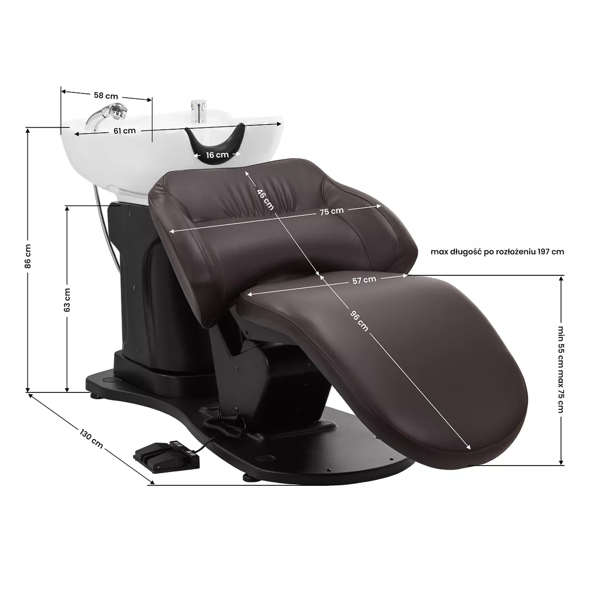 Myjnia jest wyposażona w baterię z mieszaczem, co zapewnia stały dostęp do ciepłej oraz zimnej wody. Pozwala to w łatwy sposób dopasować temperaturę do preferencji klienta. Słuchawka natryskowa z wężem o długości 120 cm oraz dedykowane miejsce na jej odłożenie ułatwiają pracę, a chromowany korek ze specjalnym sitkiem pozwala na kontrolę przepływu wody oraz utrzymanie wysokich standardów higieny w salonie. Przyłącze wody zostało umieszczone wewnątrz kolumny, co umożliwia sprawne ukrywanie wszelkich rur, przy czym łatwy w demontażu panel zapewnia bezproblemowy dostęp w razie potrzeby. Fotel wyprofilowano w taki sposób, by zapewniał wygodę podczas wykonywania różnorodnych zabiegów, a podnóżek zapewnia doskonałe podparcie dla nóg. Połączenie funkcjonalności i udogodnień sprawia, że praca w salonie fryzjerskim stanie się jeszcze bardziej komfortowa.