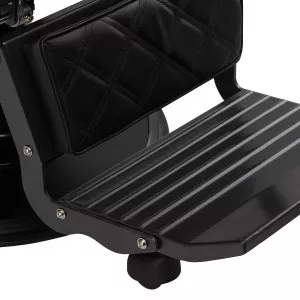 Solidna podstawa zapewnia stabilność oraz wysoki komfort użytkowania. Wypełnienie siedziska z odpornej na odkształcenia pianki oraz obicie wykonane z przyjemnej w dotyku skóry syntetycznej o matowym wykończeniu zapewniają trwałość mebla i komfortowe użytkowanie przez długi czas. Materiały te są odporne na wilgoć, wytrzymałe i łatwe w czyszczeniu. Czarny odcień tapicerki nadaje fotelowi wyjątkowy charakter, a jego elegancki styl idealnie komponuje się z wystrojem salonów barberskich.