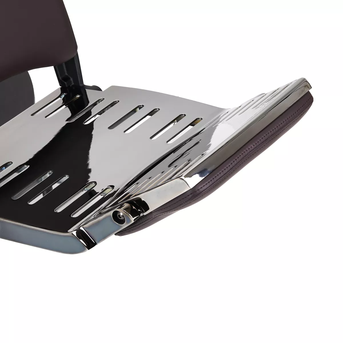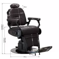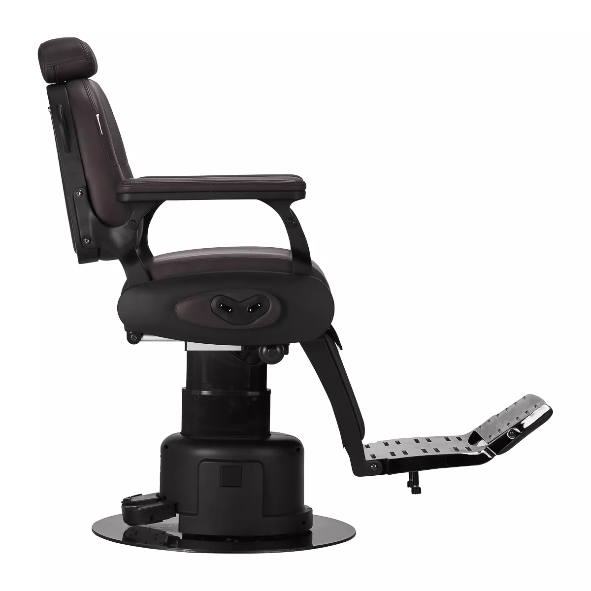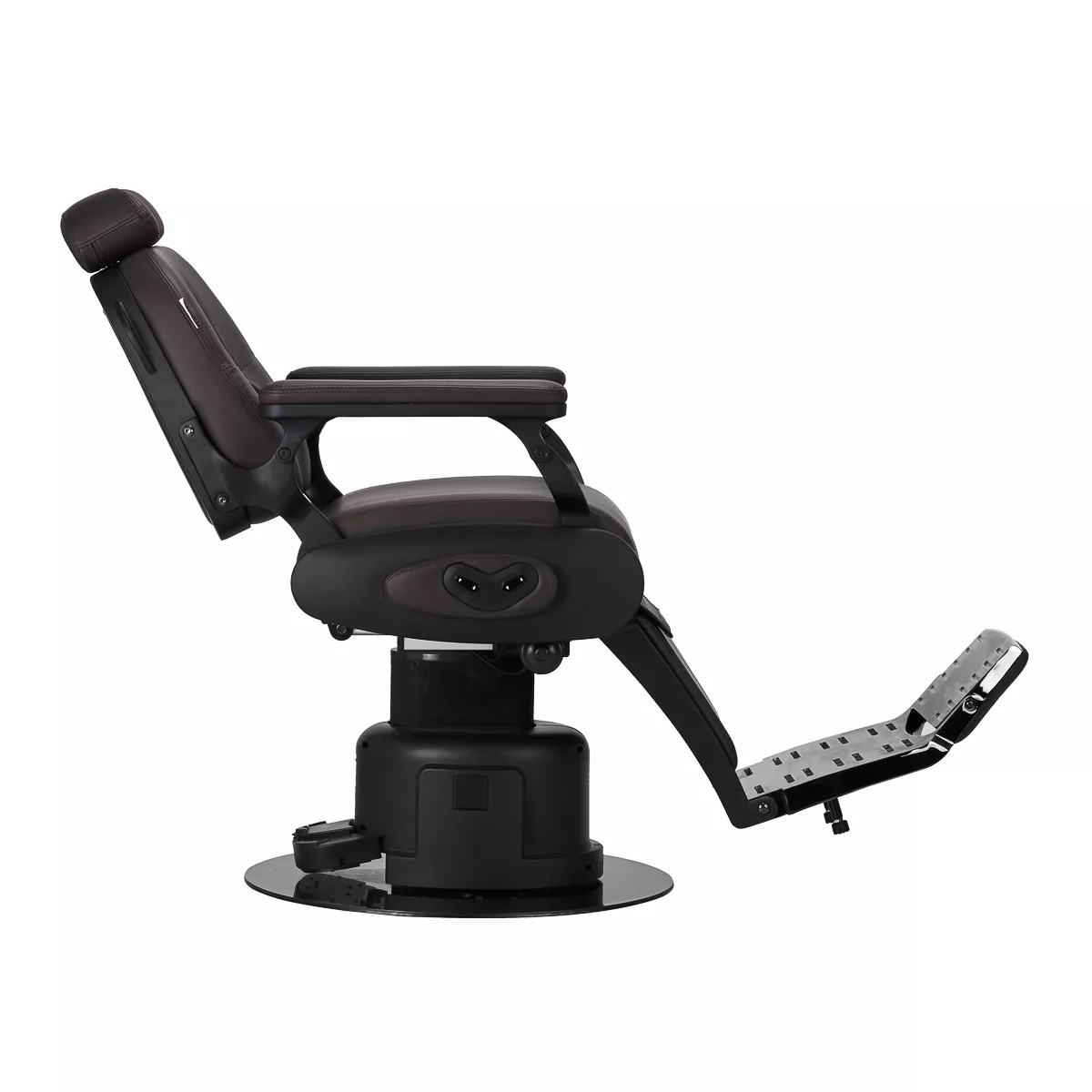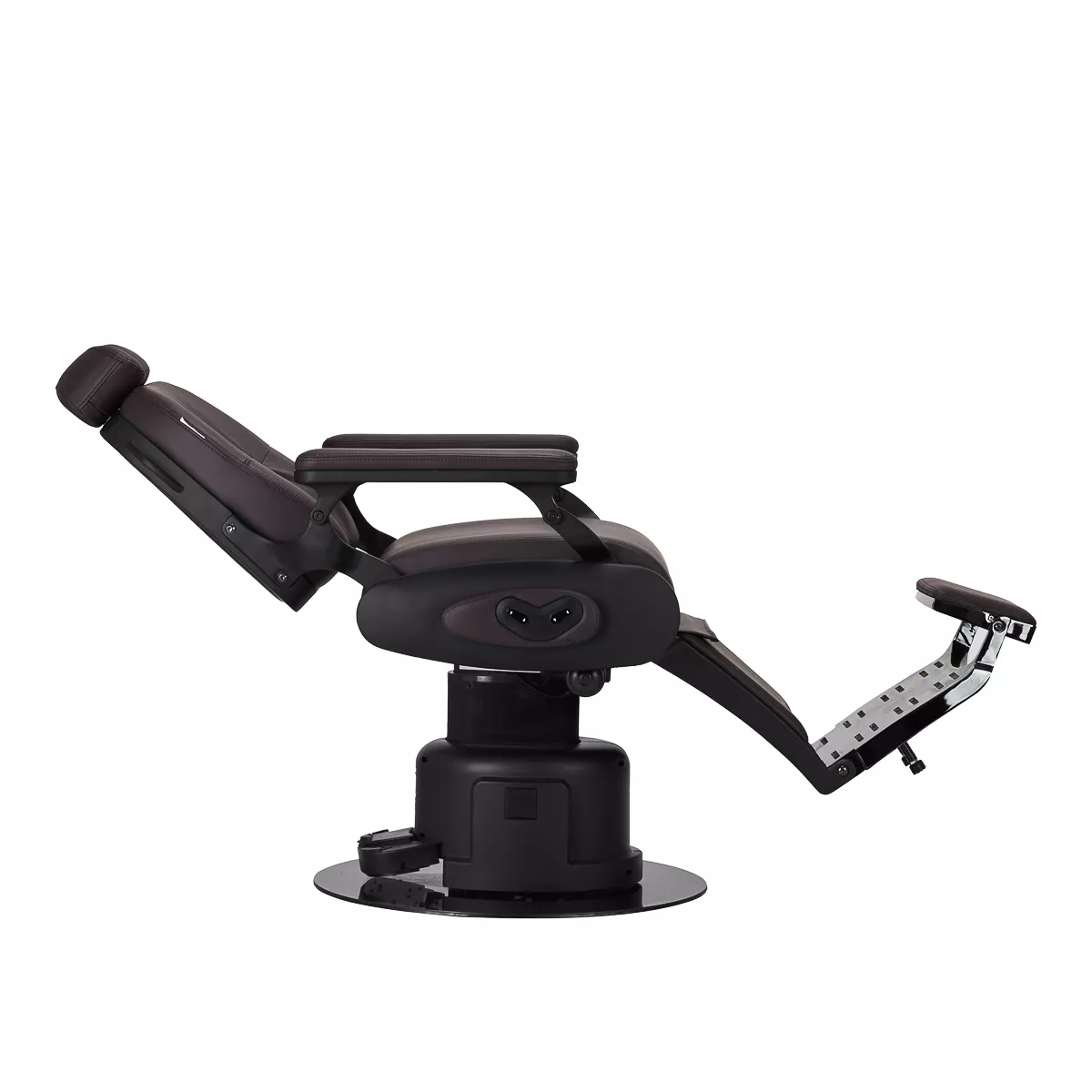 Elektryczny system sterowania gwarantuje szerokie możliwości regulacji. Umożliwia precyzyjne dostosowanie wysokości siedziska w zakresie 58-72 cm oraz niemal pełen obrót, co zapewnia barberom znaczną swobodę ruchu, nawet w mniejszych przestrzeniach. Sterowanie odbywa się zarówno za pomocą przycisków umieszczonych z boku fotela, jak i za pomocą sterowania nożnego, co daje dodatkową elastyczność podczas pracy. Podnoszenie oparcia i podnóżka jest również sterowane elektrycznie, co pozwala na szybkie i płynne dostosowanie pozycji klienta do wykonywanego zabiegu.