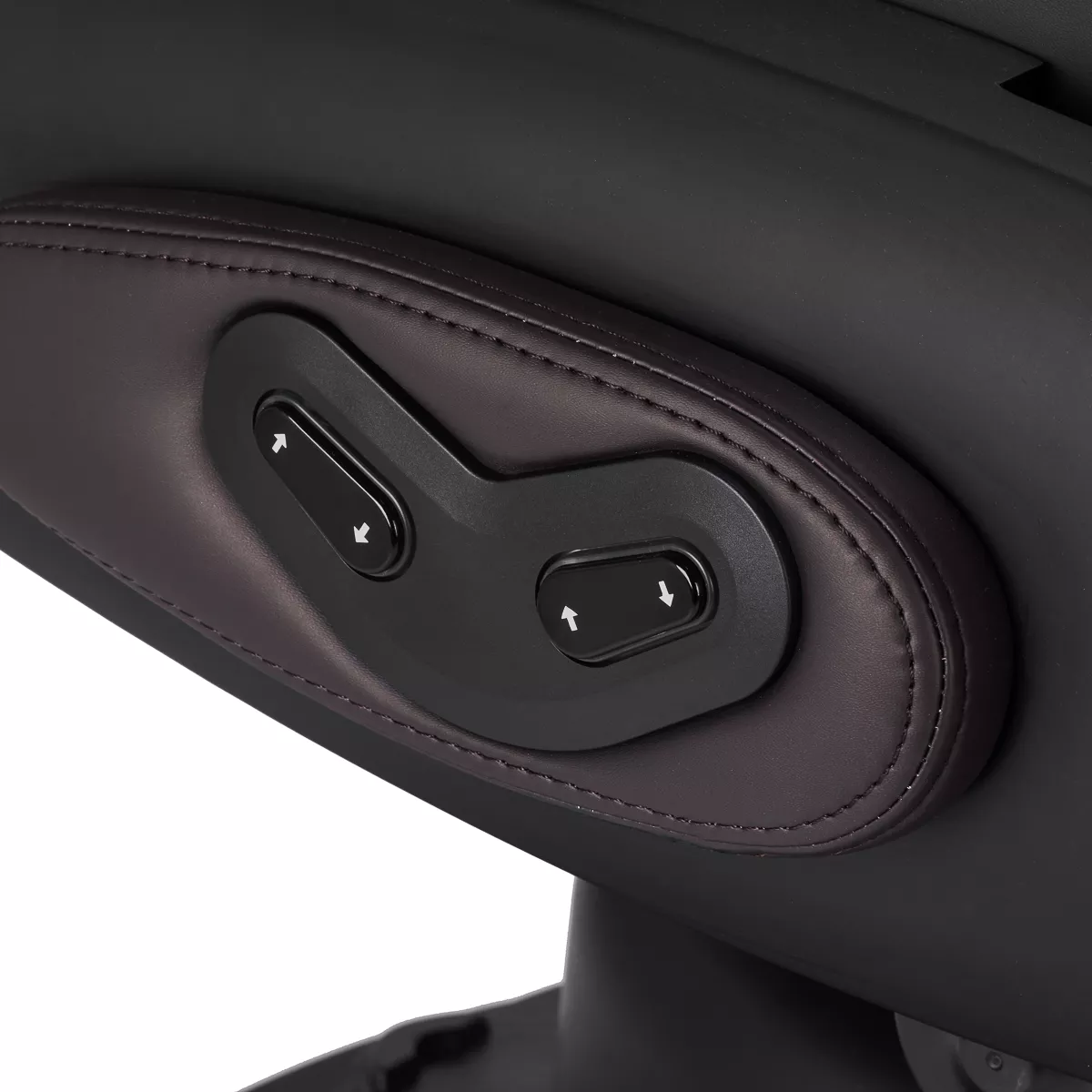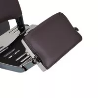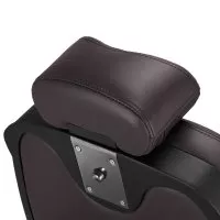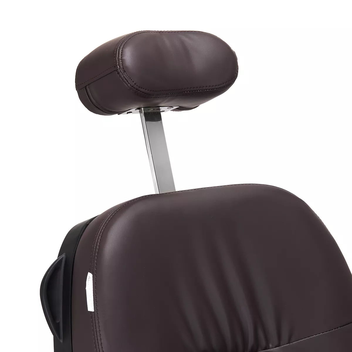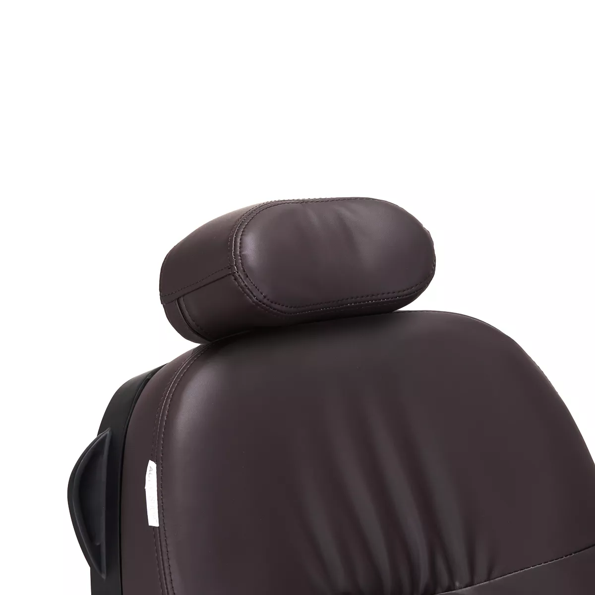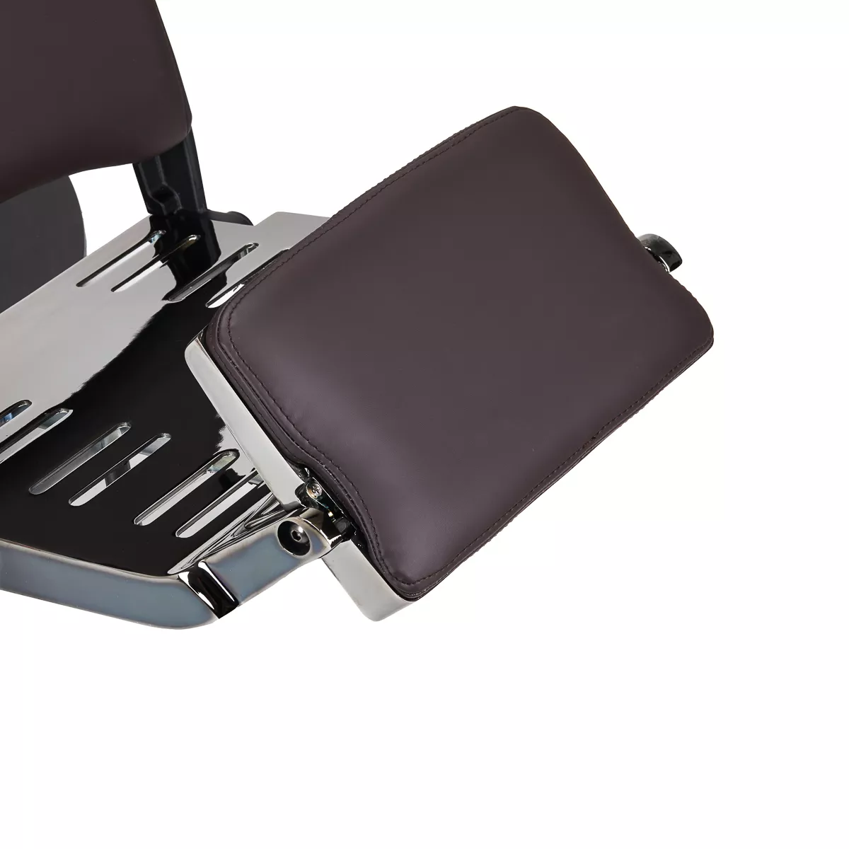 Wyprofilowane oparcie i wysuwany o 30 cm zagłówek gwarantują komfortowe podparcie pleców i głowy, co jest szczególnie istotne podczas dłuższych zabiegów. Mechanizm obrotu sprawia, że praca staje się bardziej efektywna, ułatwiając dostęp do klienta z każdej strony, nawet w niewielkich przestrzeniach. Fotel rozkłada się do półleżącej pozycji. Takie ustawienie gwarantuje lepszy dostęp podczas niektórych usług. Podłokietniki umieszczone na odpowiedniej wysokości umożliwiają prawidłowe ułożenie barków klienta – sprawia to, że nie chowa głowy w ramionach ani się nie garbi – znacząco ułatwiając wykonywanie precyzyjnych zabiegów.