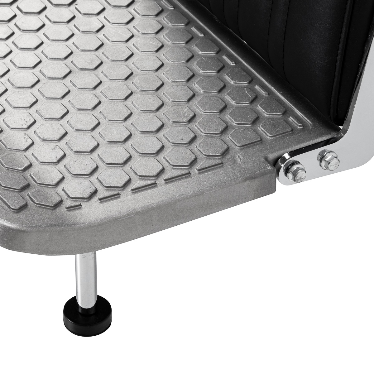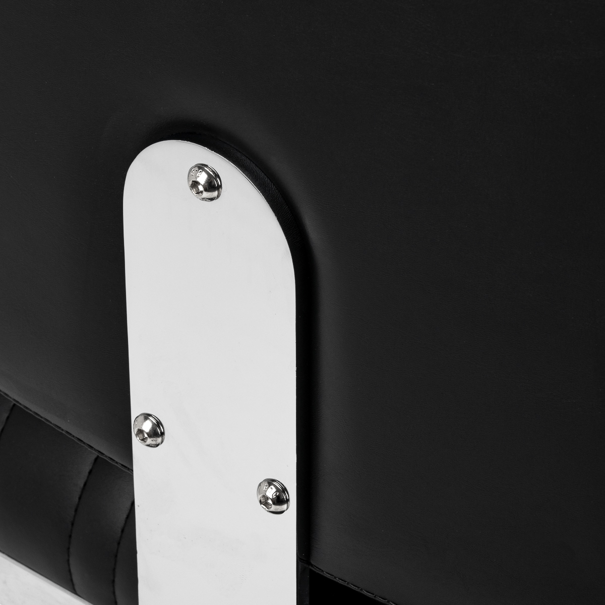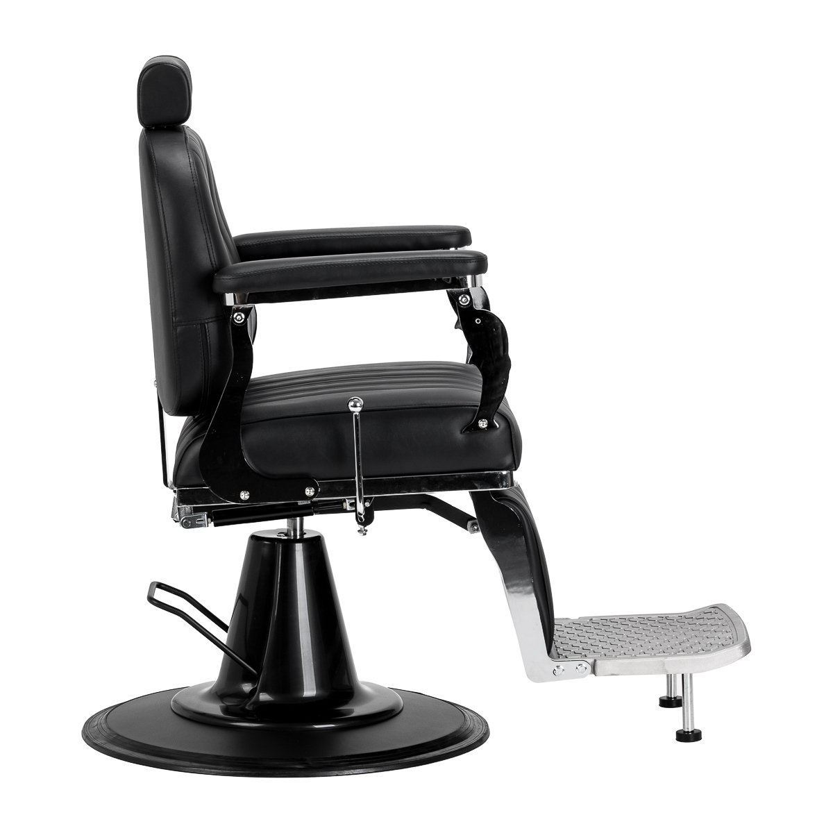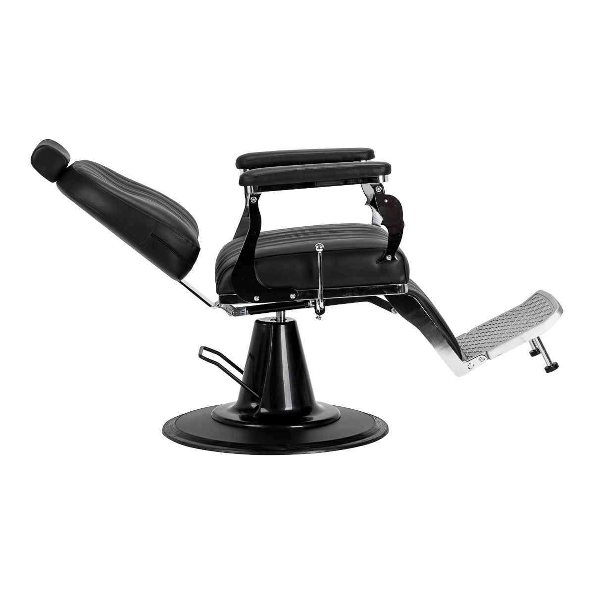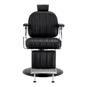 Stabilna podstawa zapewnia pewne podparcie i wysoki komfort użytkowania. Siedzisko wypełnione pianką odporną na odkształcenia oraz tapicerka z półmatowej skóry syntetycznej gwarantują trwałość i wygodę przez długi czas. Materiały wyróżniają się odpornością na wilgoć oraz łatwością utrzymania w czystości. Czarna tapicerka zestawiona z metalowymi, chromowanymi elementami oraz dekoracyjnym podnóżkiem nadaje fotelowi wyrazisty, klasyczny charakter. Pionowe przeszycia podkreślają stylistykę vintage, doskonale wpisującą się w klimat profesjonalnych salonów barberskich. Starannie dopracowane detale nadają całości reprezentacyjny wygląd, a funkcjonalna konstrukcja sprzyja komfortowej i efektywnej pracy.