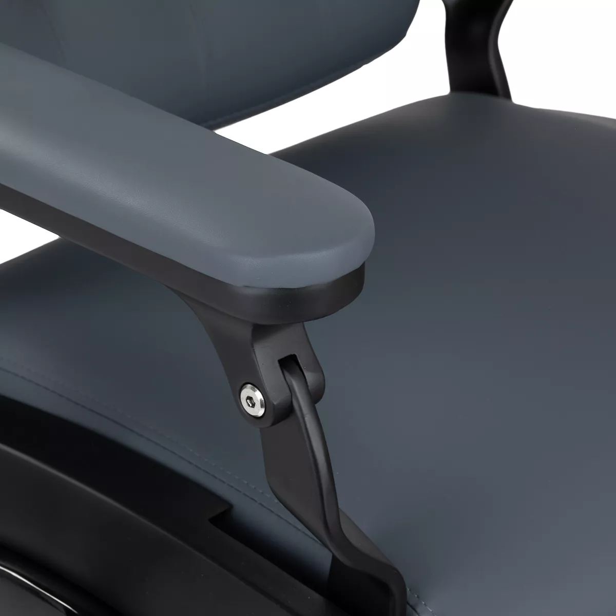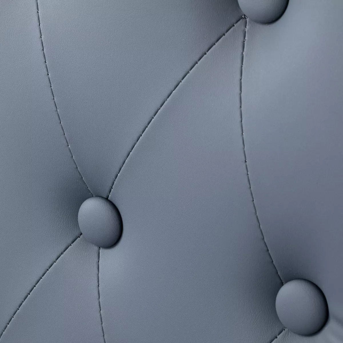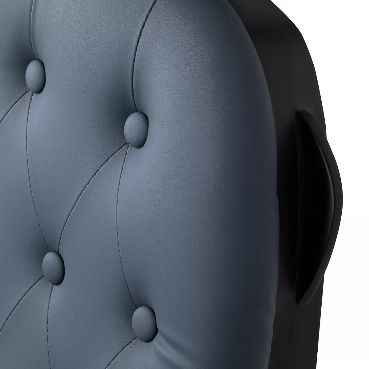 Stabilna konstrukcja podstawy z elementami w odcieniach czerni zapewnia wysoki komfort użytkowania. Wypełnienie z trwałej, odpornej na odkształcenia pianki oraz obicie wykonane z przyjemnej w dotyku skóry syntetycznej zapewniają trwałość mebla i jego komfortowe użytkowanie przez długi czas. Sprawiają również, że sprzęt jest odporny na wilgoć, wytrzymały oraz łatwy do czyszczenia. Pokrycie w odcieniach grafitu wraz z oryginalnym pikowaniem i ozdobnymi guzikami nadają mu wyjątkowego charakteru. Designerskie elementy dekoracyjne inspirowane motocyklami, nawiązujące do stylu vintage, doskonale wpasują się w klimat salonów barberskich, tworząc ich niesamowitą atmosferę.