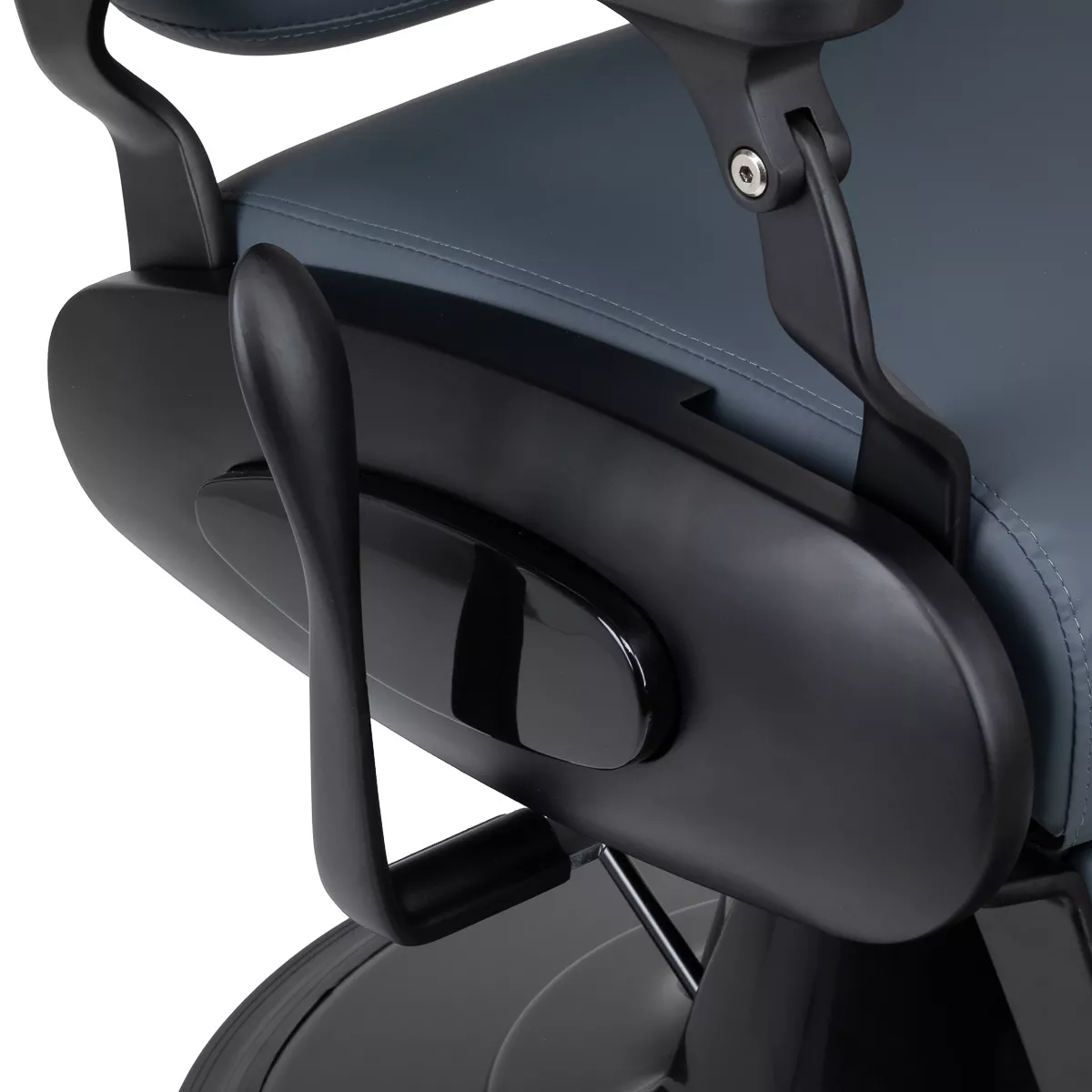 Szerokie siedzisko wypełnione odporną na odkształcenia pianką gwarantuje klientowi wygodę w trakcie zabiegów. Oparcie obite jest skórą syntetyczną i pozwala na zajęcie dogodnej pozycji, zapewniając doskonałe wsparcie dla pleców, co ma znaczenie zwłaszcza w przypadku dłuższych zabiegów. Wyposażenie fotela w mechanizm pełnego obrotu sprawia, że praca fryzjera staje się bardziej efektywna i wygodna. Tapicerowane podłokietniki umieszczone na odpowiedniej wysokości umożliwiają prawidłowe ułożenie barków klienta – sprawia to, że nie chowa głowy w ramionach ani się nie garbi – znacząco ułatwiając wykonywanie precyzyjnych zabiegów. Solidna, szeroka podstawa odpowiada za doskonałą stabilność mebla podczas pracy.