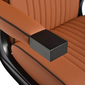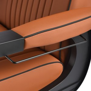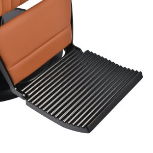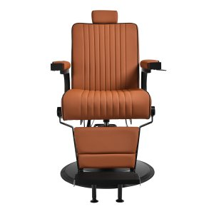 Czarna, okrągła podstawa zapewnia stabilność oraz trwałość użytkowania. Obicie z miękkiej, matowej skóry syntetycznej łączy komfort z wytrzymałością. Zastosowane materiały są odporne na wilgoć, trwałe i łatwe w czyszczeniu. Stylowe przeszycia i tapicerka w odcieniach brązu nadają mu wyjątkowego charakteru, idealnie komponującego się z wystrojem nowoczesnych salonów barberskich. Połączenie eleganckiego odcienia obicia z czarną ramą i podstawą podkreśla nowoczesny, profesjonalny wygląd fotela.