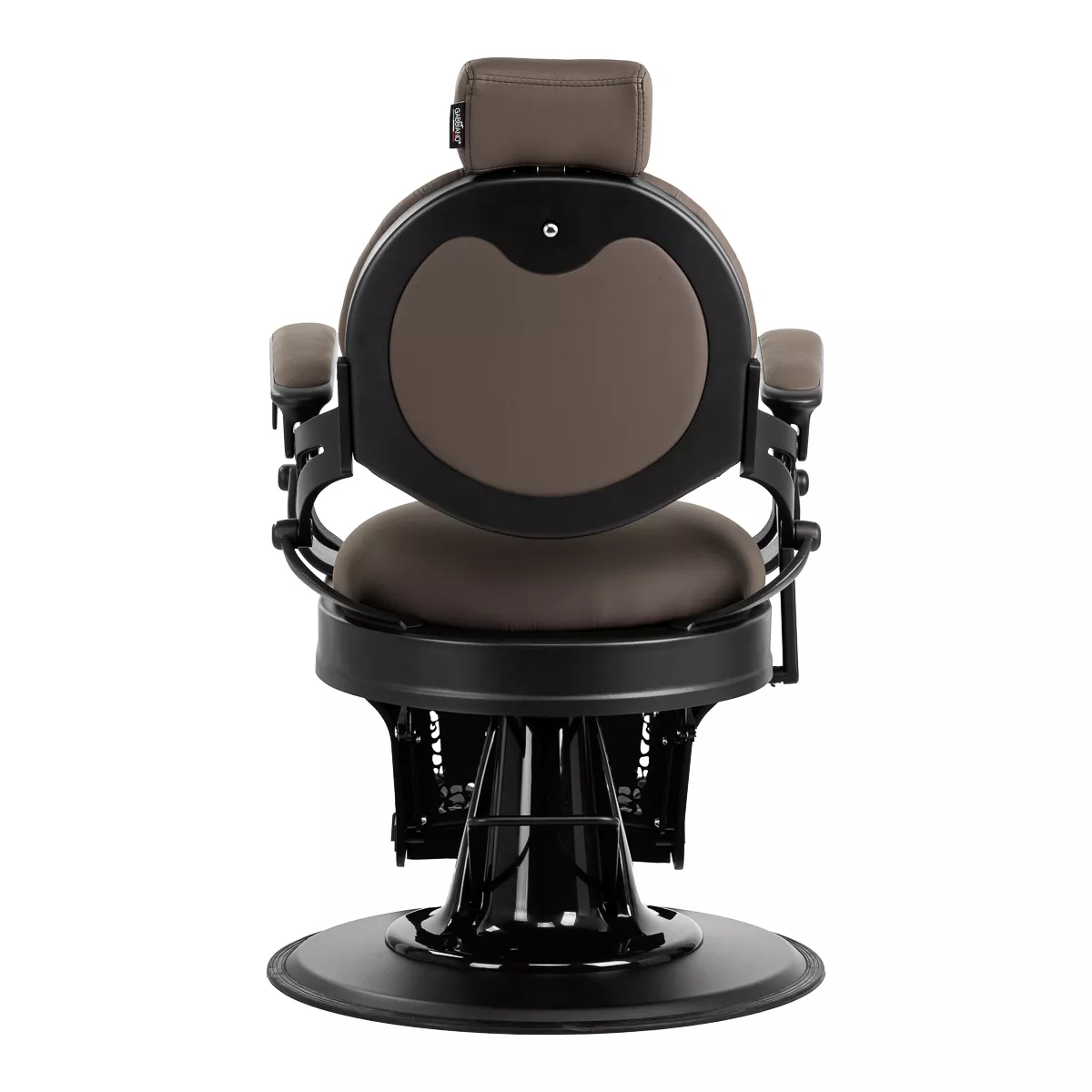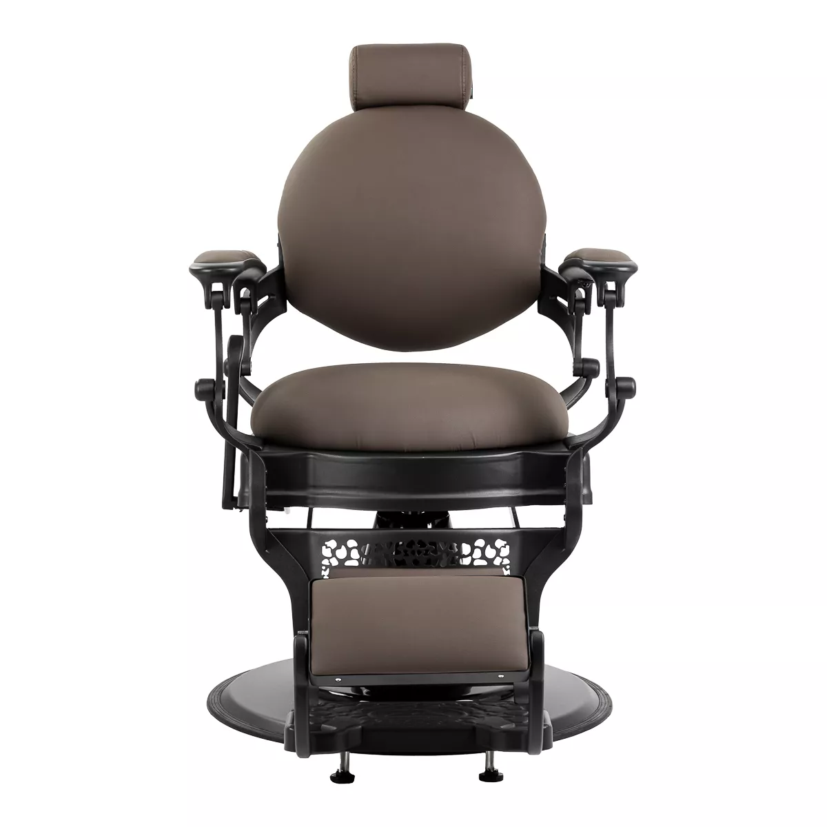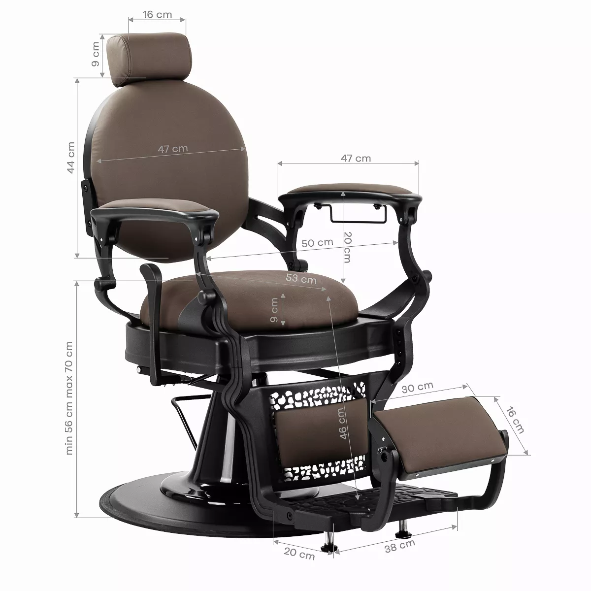 Solidna konstrukcja podstawy zapewnia stabilność oraz wysoki komfort użytkowania. Wypełnienie siedziska z trwałej, odpornej na odkształcenia pianki oraz obicie wykonane z przyjemnej w dotyku skóry syntetycznej o matowym wykończeniu zapewniają trwałość mebla oraz jego komfortowe użytkowanie przez długi czas. Zastosowane materiały sprawiają również, że sprzęt jest odporny na wilgoć, wytrzymały oraz łatwy do czyszczenia. Pokrycie w odcieniach brązu oraz zdobiony podnóżek nadają mu wyjątkowego charakteru. Fotel o charakterystycznym designie, nawiązującym do stylu vintage, doskonale pasuje do klimatu salonów barberskich, podkreślając ich wyjątkową atmosferę.