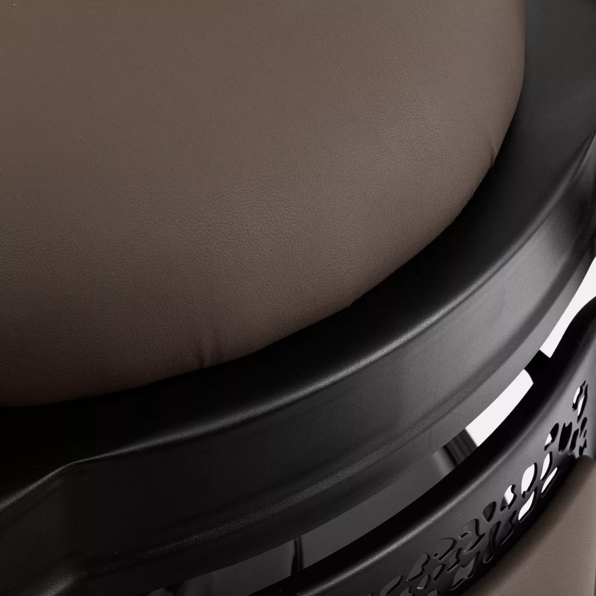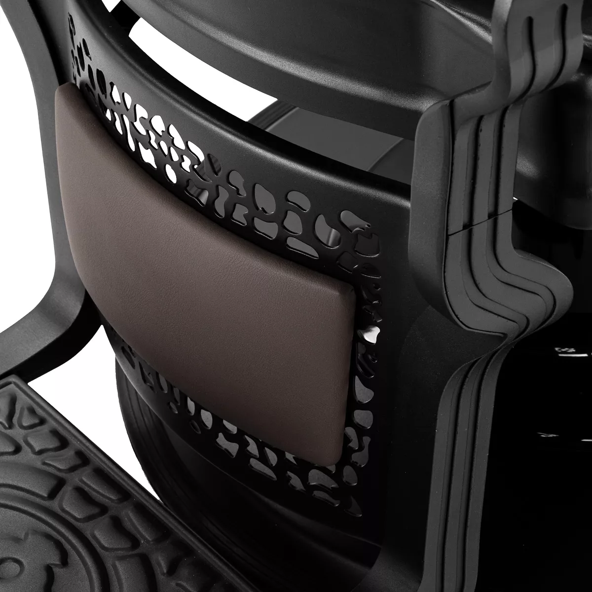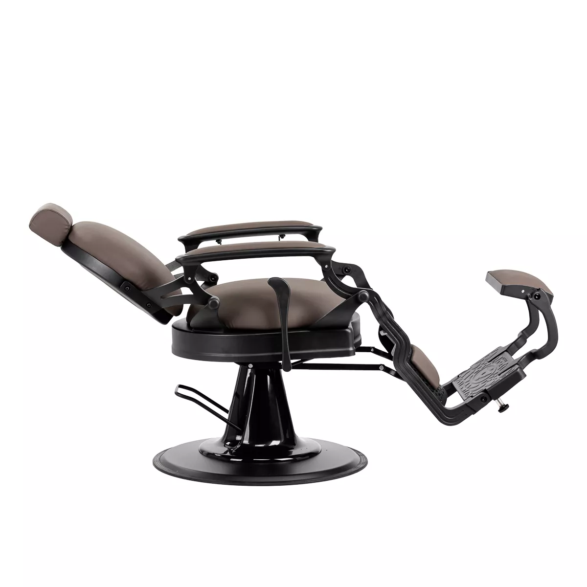 Solidna konstrukcja podstawy zapewnia stabilność oraz wysoki komfort użytkowania. Wypełnienie siedziska z trwałej, odpornej na odkształcenia pianki oraz obicie wykonane z przyjemnej w dotyku skóry syntetycznej o matowym wykończeniu zapewniają trwałość mebla oraz jego komfortowe użytkowanie przez długi czas. Zastosowane materiały sprawiają również, że sprzęt jest odporny na wilgoć, wytrzymały oraz łatwy do czyszczenia. Pokrycie w odcieniach brązu oraz zdobiony podnóżek nadają mu wyjątkowego charakteru. Fotel o charakterystycznym designie, nawiązującym do stylu vintage, doskonale pasuje do klimatu salonów barberskich, podkreślając ich wyjątkową atmosferę.