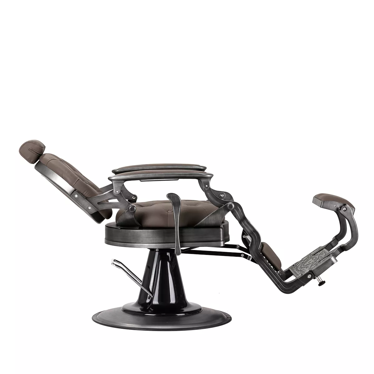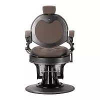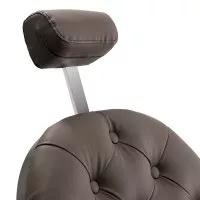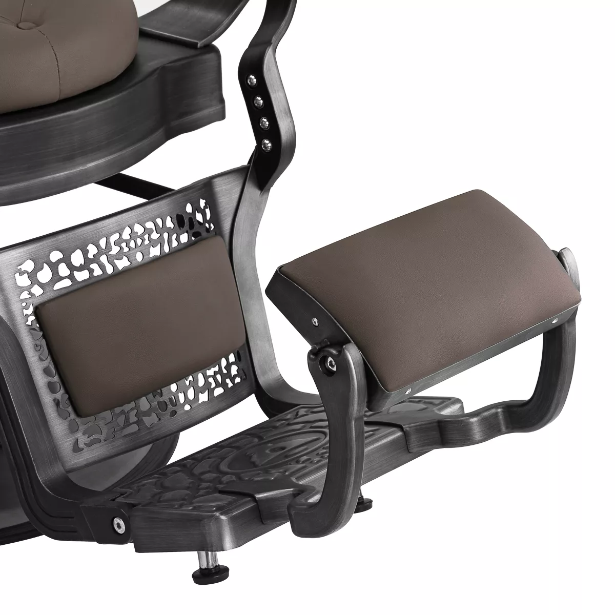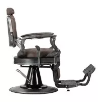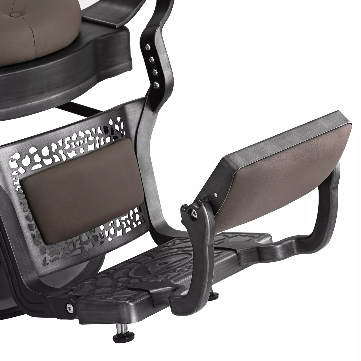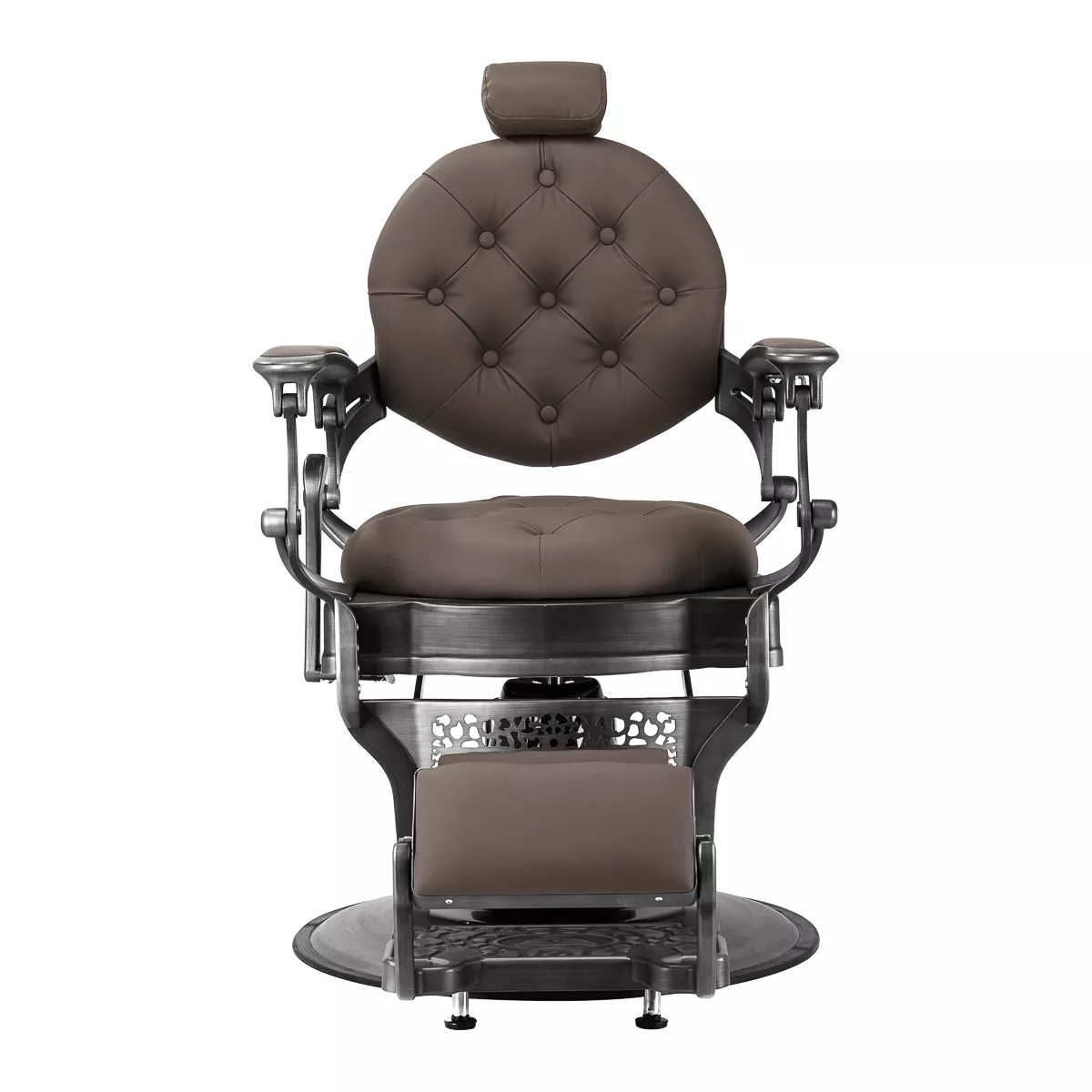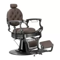 Solidna konstrukcja podstawy zapewnia stabilność oraz wysoki komfort użytkowania. Wypełnienie siedziska z trwałej, odpornej na odkształcenia pianki oraz obicie wykonane z przyjemnej w dotyku skóry syntetycznej o matowym wykończeniu zapewniają trwałość mebla oraz jego komfortowe użytkowanie przez długi czas. Zastosowane materiały sprawiają również, że sprzęt jest odporny na wilgoć, wytrzymały oraz łatwy do czyszczenia. Pokrycie w odcieniach brązu z pikowaniem i ozdobnymi guzikami oraz zdobiony podnóżek nadają mu wyjątkowego charakteru. Fotel o charakterystycznym designie, nawiązującym do stylu vintage, doskonale pasuje do klimatu salonów barberskich, podkreślając ich wyjątkową atmosferę.