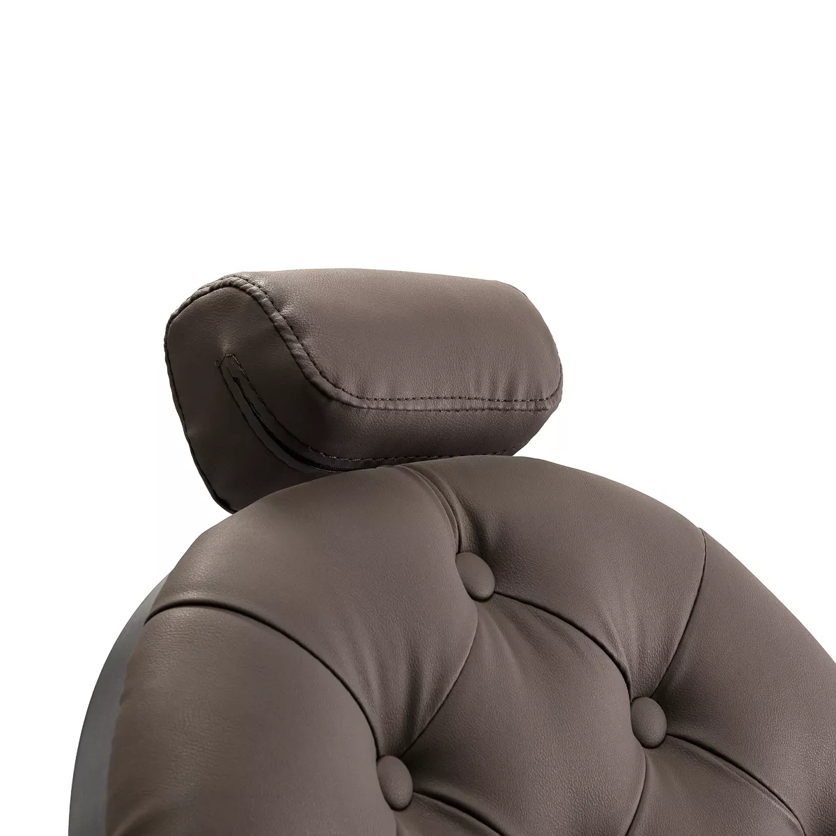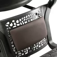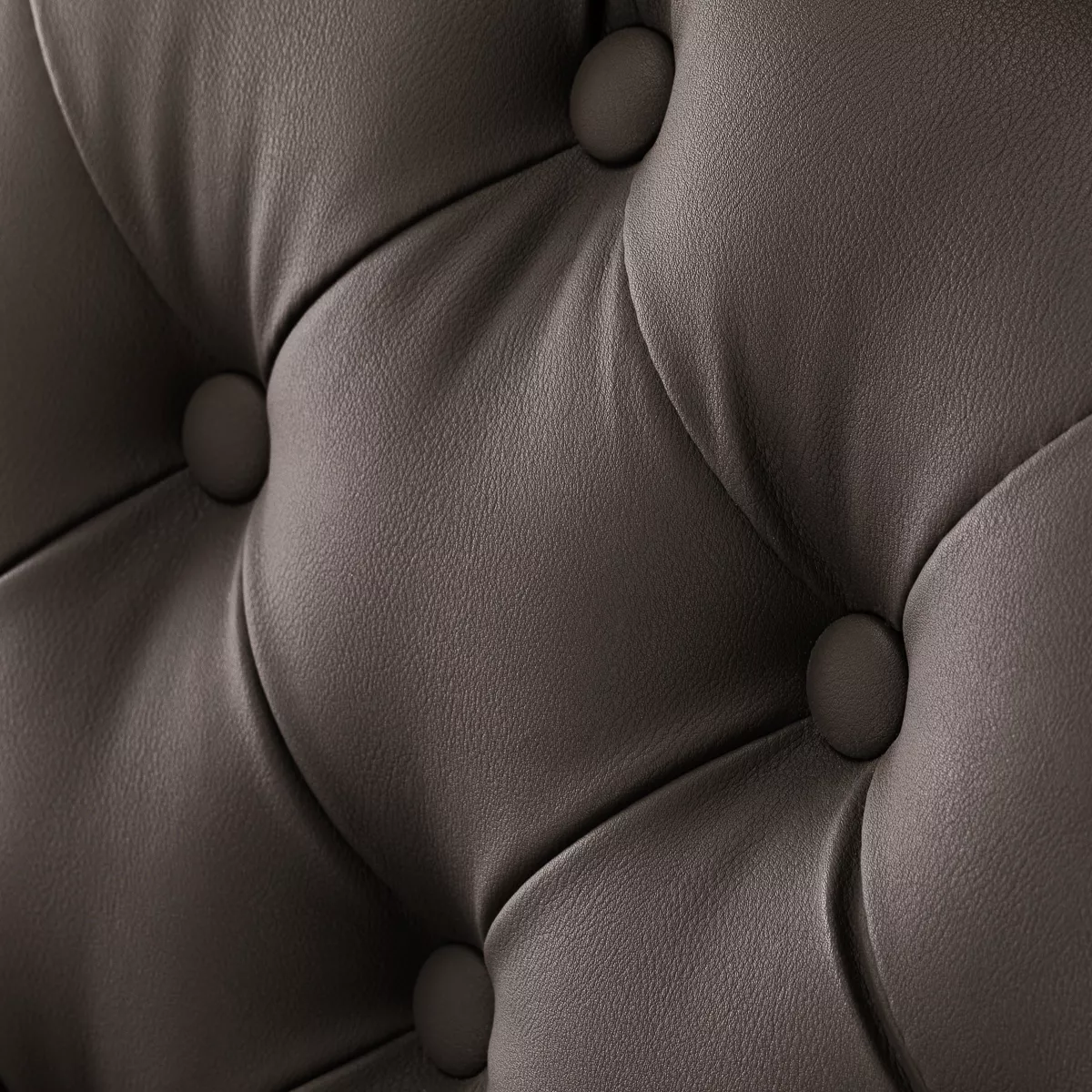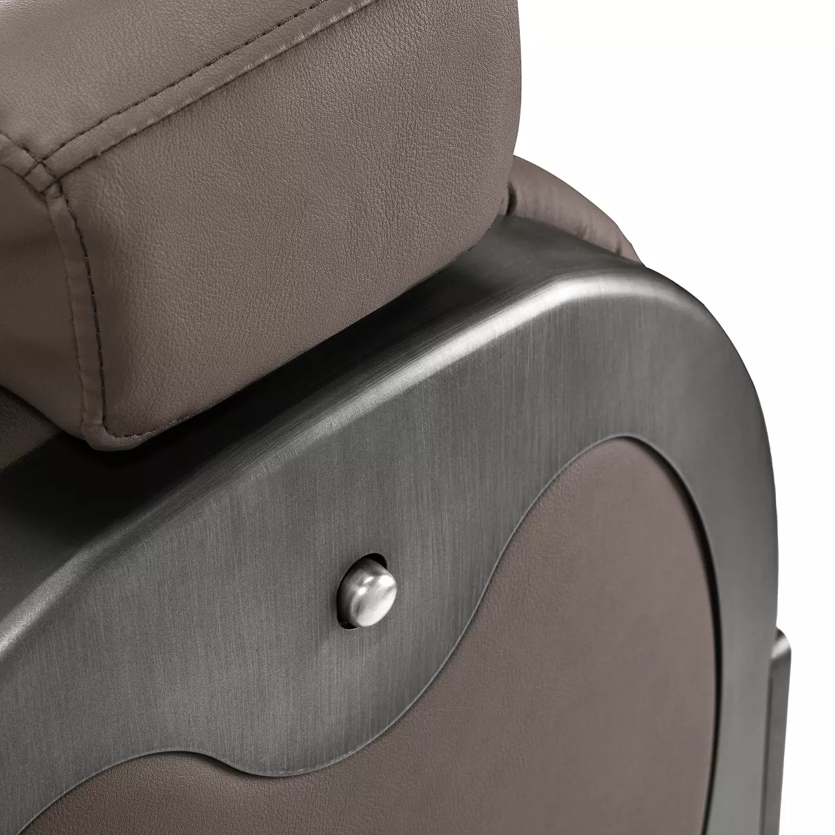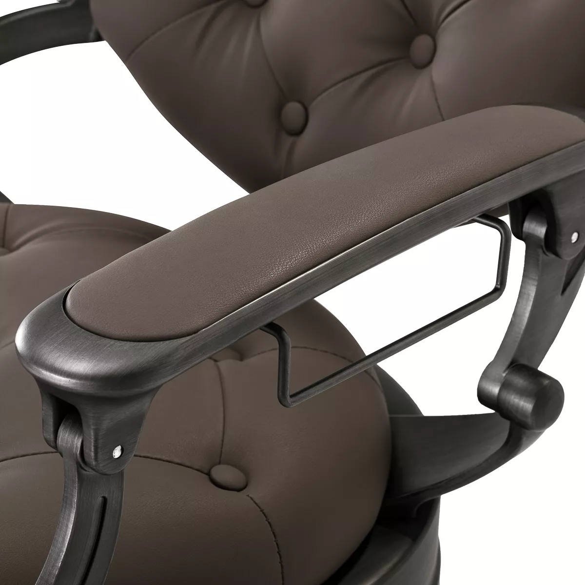 Solidna konstrukcja podstawy zapewnia stabilność oraz wysoki komfort użytkowania. Wypełnienie siedziska z trwałej, odpornej na odkształcenia pianki oraz obicie wykonane z przyjemnej w dotyku skóry syntetycznej o matowym wykończeniu zapewniają trwałość mebla oraz jego komfortowe użytkowanie przez długi czas. Zastosowane materiały sprawiają również, że sprzęt jest odporny na wilgoć, wytrzymały oraz łatwy do czyszczenia. Pokrycie w odcieniach brązu z pikowaniem i ozdobnymi guzikami oraz zdobiony podnóżek nadają mu wyjątkowego charakteru. Fotel o charakterystycznym designie, nawiązującym do stylu vintage, doskonale pasuje do klimatu salonów barberskich, podkreślając ich wyjątkową atmosferę.