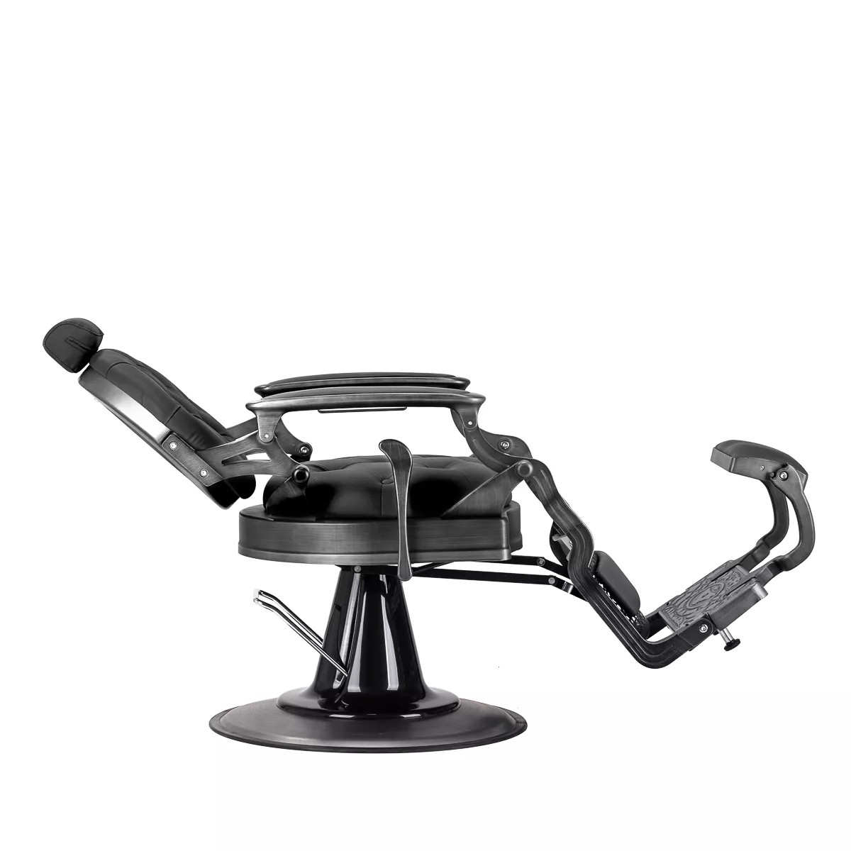 Solidna konstrukcja podstawy zapewnia stabilność oraz wysoki komfort użytkowania. Wypełnienie siedziska z trwałej, odpornej na odkształcenia pianki oraz obicie wykonane z przyjemnej w dotyku skóry syntetycznej o matowym wykończeniu zapewniają trwałość mebla oraz jego komfortowe użytkowanie przez długi czas. Zastosowane materiały sprawiają również, że sprzęt jest odporny na wilgoć, wytrzymały oraz łatwy do czyszczenia. Pokrycie w odcieniach czerni z pikowaniem i ozdobnymi guzikami oraz zdobiony podnóżek nadają mu wyjątkowego charakteru. Fotel o charakterystycznym designie, nawiązującym do stylu vintage, doskonale pasuje do klimatu salonów barberskich, podkreślając ich wyjątkową atmosferę.