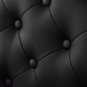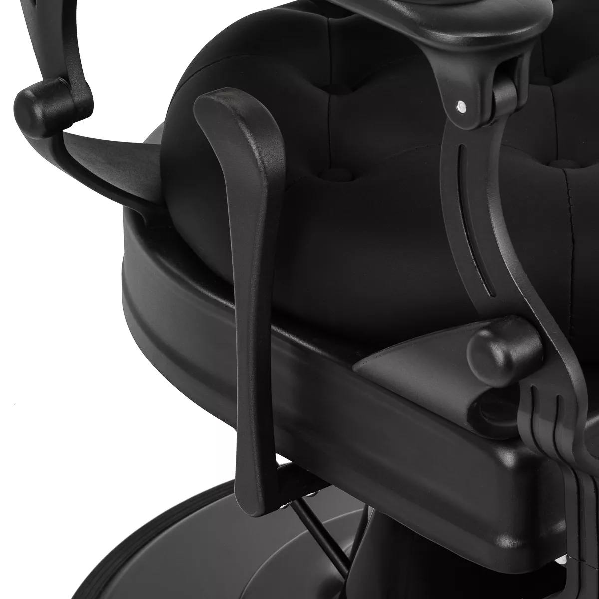 Solidna konstrukcja podstawy zapewnia stabilność oraz wysoki komfort użytkowania. Wypełnienie siedziska z trwałej, odpornej na odkształcenia pianki oraz obicie wykonane z przyjemnej w dotyku skóry syntetycznej o matowym wykończeniu zapewniają trwałość mebla oraz jego komfortowe użytkowanie przez długi czas. Zastosowane materiały sprawiają również, że sprzęt jest odporny na wilgoć, wytrzymały oraz łatwy do czyszczenia. Pokrycie w odcieniach czerni z pikowaniem i ozdobnymi guzikami oraz zdobiony podnóżek nadają mu wyjątkowego charakteru. Fotel o charakterystycznym designie, nawiązującym do stylu vintage, doskonale pasuje do klimatu salonów barberskich, podkreślając ich wyjątkową atmosferę.