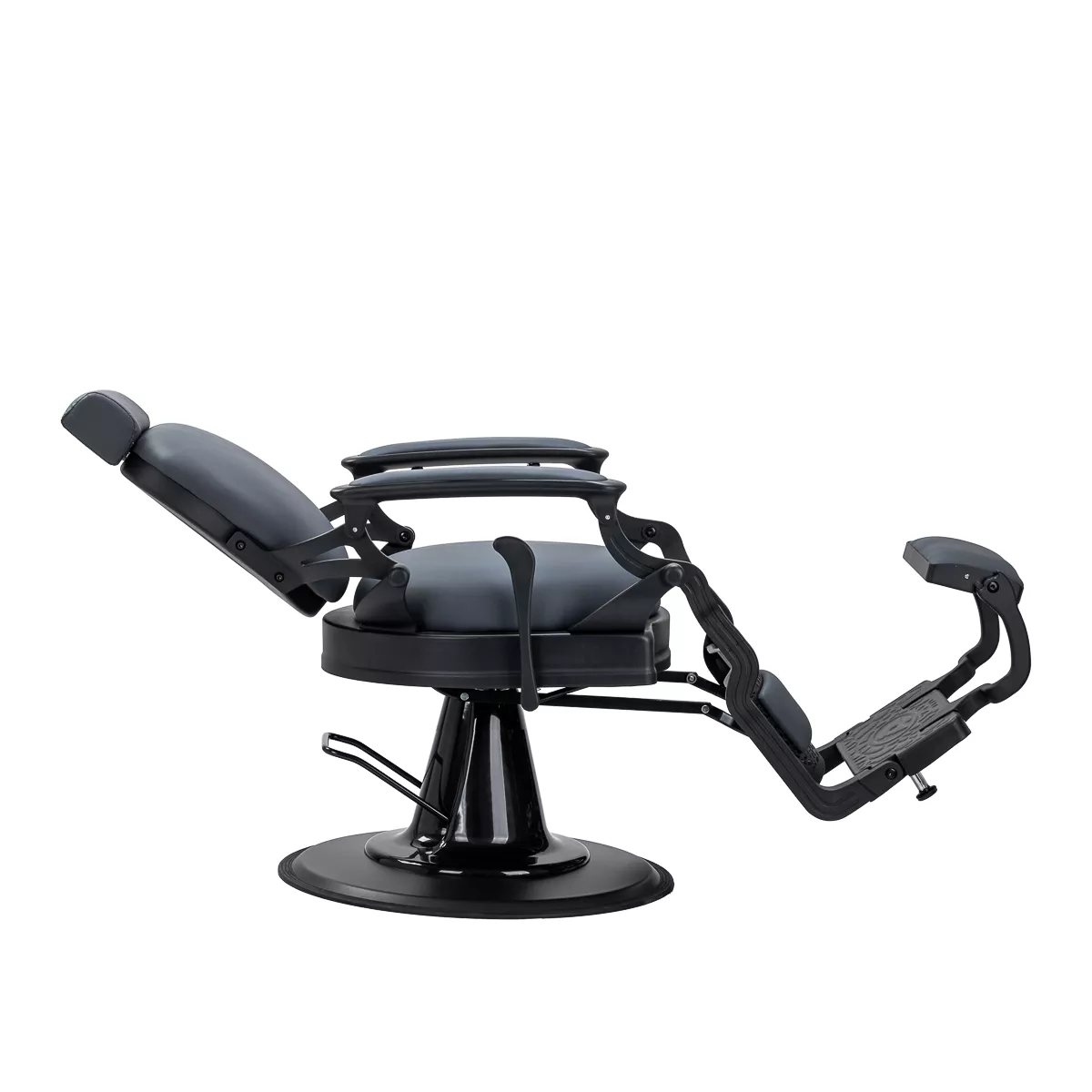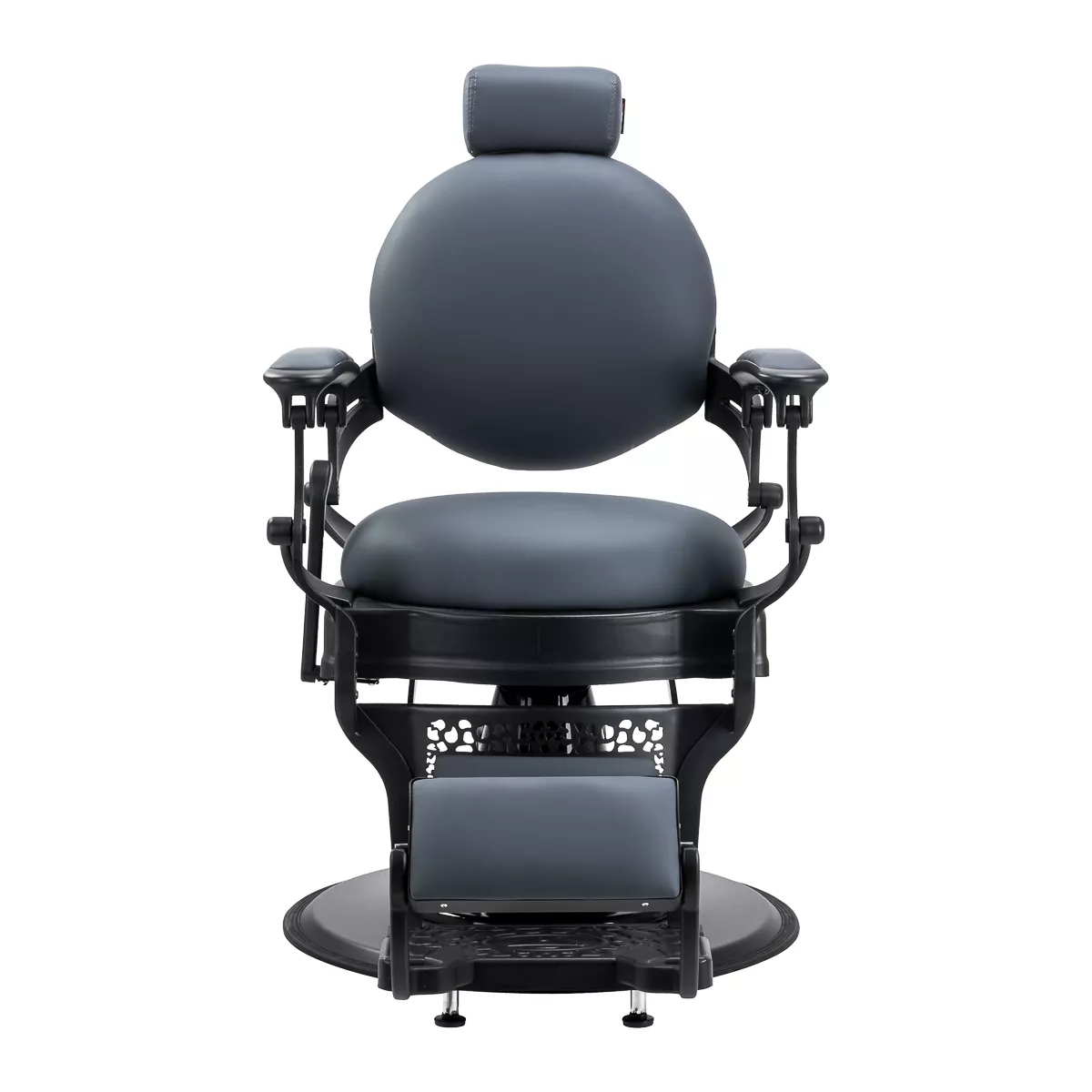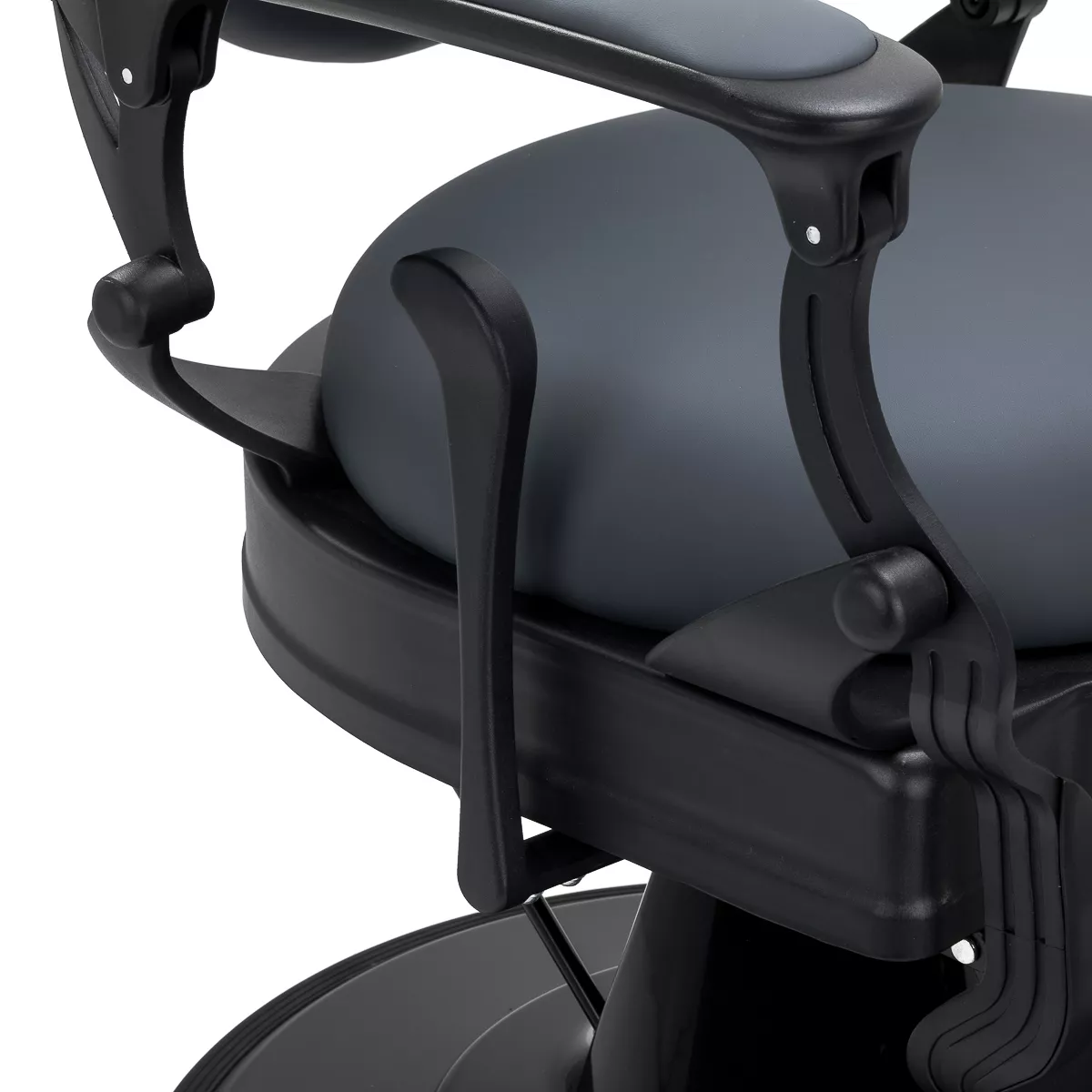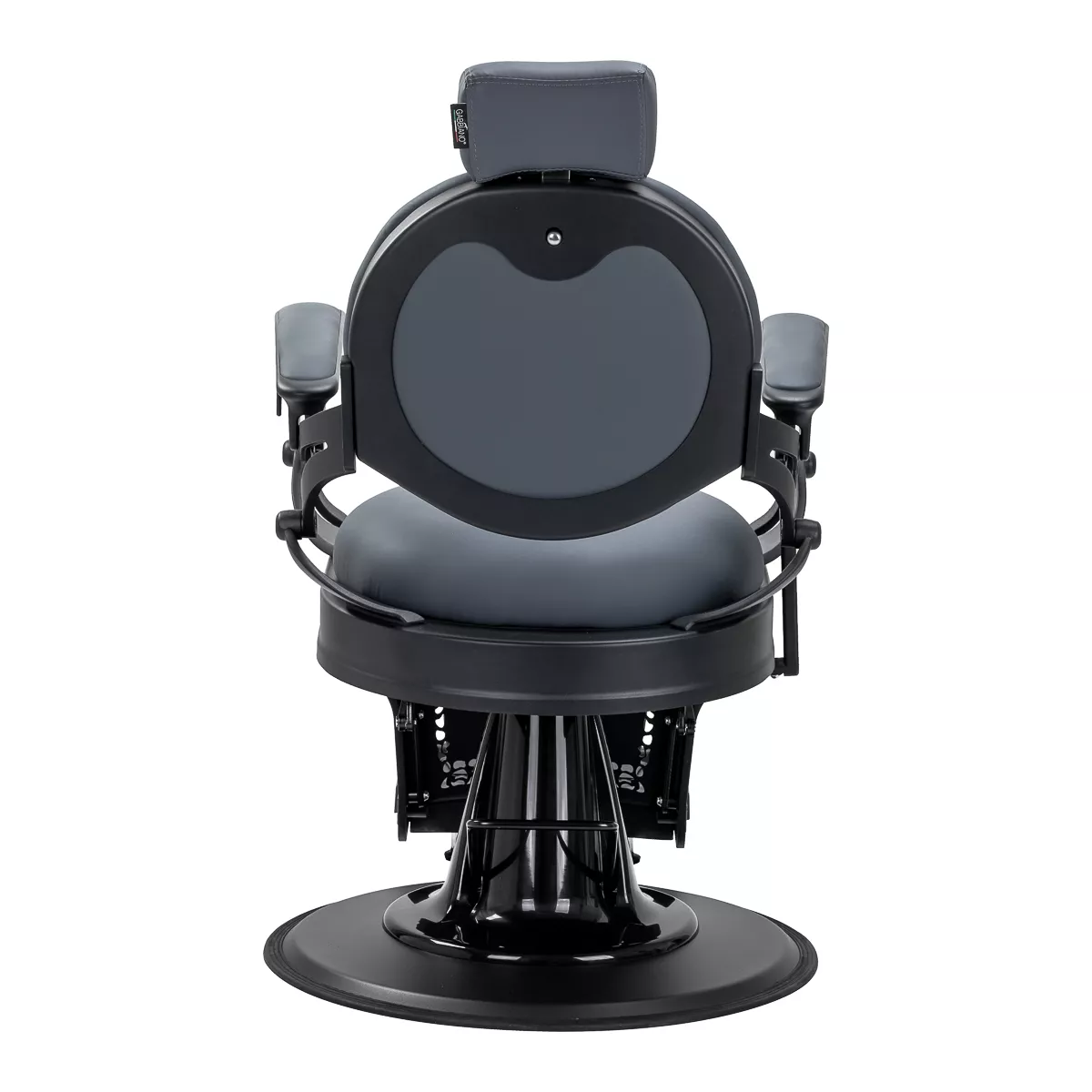 Solidna konstrukcja podstawy zapewnia stabilność oraz wysoki komfort użytkowania. Wypełnienie siedziska z trwałej, odpornej na odkształcenia pianki oraz obicie wykonane z przyjemnej w dotyku skóry syntetycznej o matowym wykończeniu zapewniają trwałość mebla oraz jego komfortowe użytkowanie przez długi czas. Zastosowane materiały sprawiają również, że sprzęt jest odporny na wilgoć, wytrzymały oraz łatwy do czyszczenia. Pokrycie w odcieniach grafitu oraz zdobiony podnóżek nadają mu wyjątkowego charakteru. Fotel o charakterystycznym designie, nawiązującym do stylu vintage, doskonale pasuje do klimatu salonów barberskich, podkreślając ich wyjątkową atmosferę.