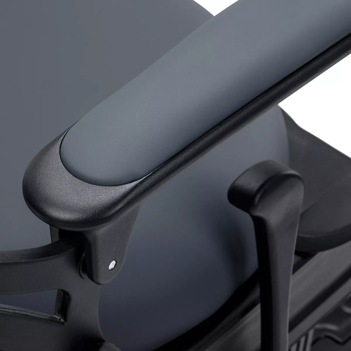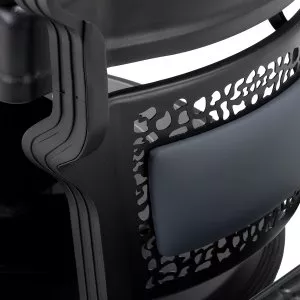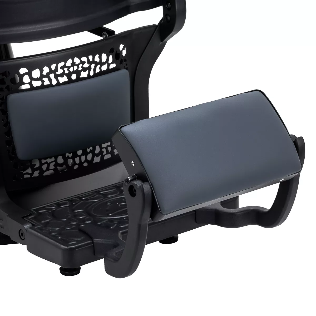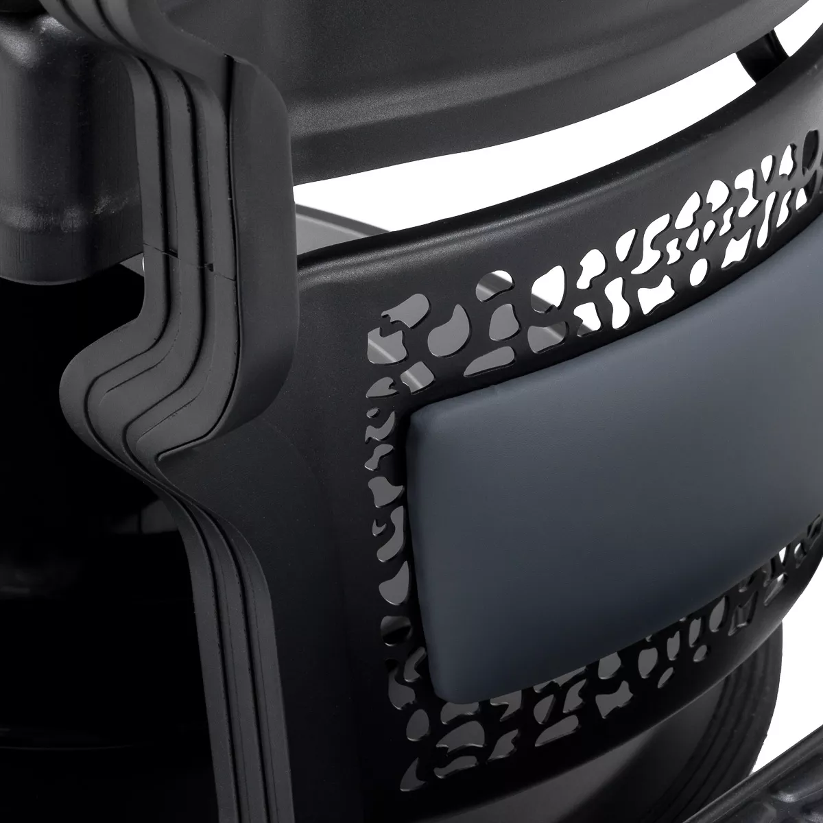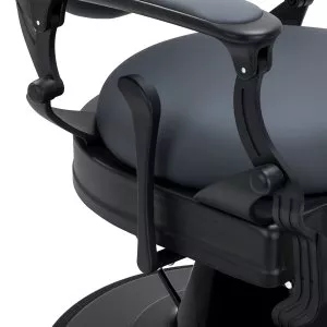 Komfortowe siedzisko wypełnione pianką gwarantuje klientowi wygodę w trakcie różnorodnych usług. Wyprofilowane oparcie pozwala na zajęcie dogodnej pozycji, zapewniając doskonałe wsparcie pleców, co jest istotne szczególnie podczas dłuższych zabiegów. Wyposażenie fotela w mechanizm pełnego obrotu sprawia, że praca staje się bardziej efektywna i wygodna. Tapicerowane podłokietniki umieszczone na odpowiedniej wysokości umożliwiają prawidłowe ułożenie barków klienta – sprawia to, że nie chowa głowy w ramionach ani się nie garbi – znacząco ułatwiając wykonywanie precyzyjnych zabiegów. Uchwyt na ręcznik pod podłokietnikiem znacznie wpływa na efektywność pracy. Otwór pomiędzy oparciem a siedziskiem ułatwia zachowanie czystości w salonie, pozwalając w łatwy sposób wymieść włosy z każdego zakamarka fotela. Usprawnia to przygotowanie stanowiska pracy pomiędzy klientami.