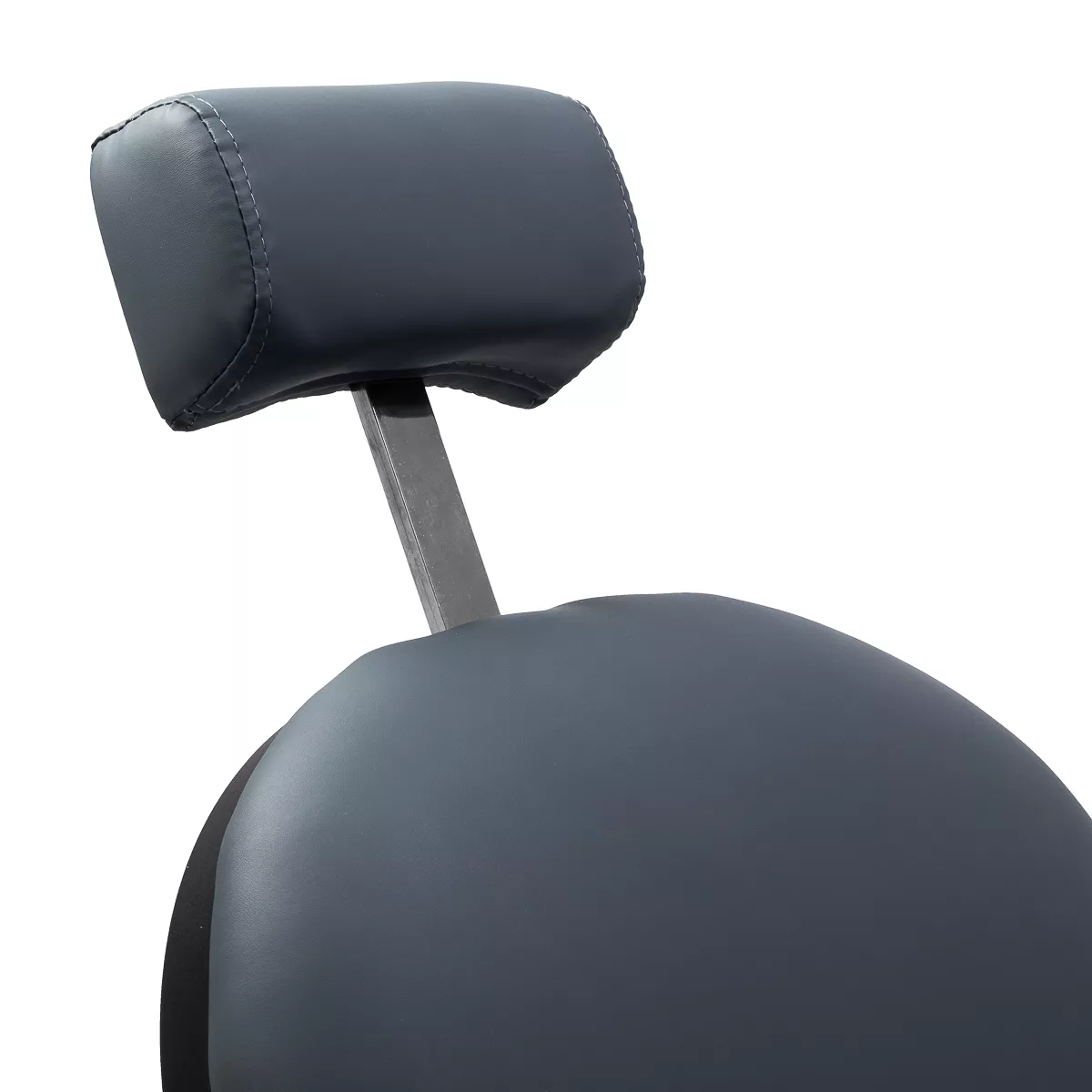 Trwały podnośnik hydrauliczny pozwala na swobodną regulację wysokości siedziska w granicach 56-70 cm, nawet w momencie, gdy klient siedzi na fotelu. Gwarantuje to ergonomię pracy oraz zapewnia możliwość dopasowania poziomu siedziska do wzrostu zarówno klienta, jak i osoby wykonującej zabieg. Fotel posiada odchylane oparcie oraz regulowany podnóżek, dzięki czemu możliwe jest ułożenie klienta w dogodnej, półleżącej pozycji. Takie ustawienie gwarantuje lepszy dostęp podczas niektórych usług. Dodatkowo wysuwany o 20 cm zagłówek zapewnia doskonałe podparcie głowy, dzięki możliwości dopasowania do indywidualnych potrzeb.
