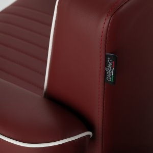 Solidna konstrukcja podstawy zapewnia stabilność oraz wysoki komfort użytkowania. Siedzisko wypełnione odporną na odkształcenia pianką oraz obite miękką, matową skórą syntetyczną łączy trwałość z komfortem. Materiały użyte do wykończenia są odporne na wilgoć, wytrzymałe i łatwe w czyszczeniu, co sprawia, że fotel doskonale sprawdza się w codziennej pracy. Stylowe przeszycia i tapicerka w odcieniach czerwieni nadają mu wyjątkowego charakteru, idealnie komponującego się z wystrojem nowoczesnych salonów barberskich.