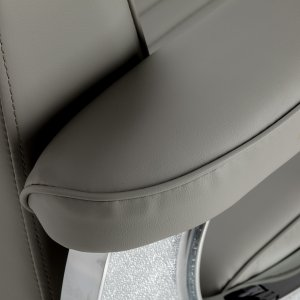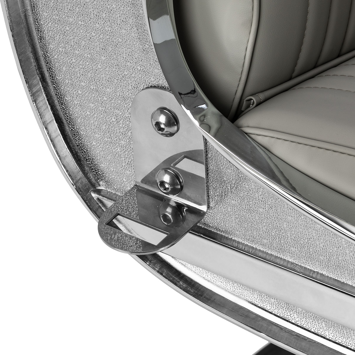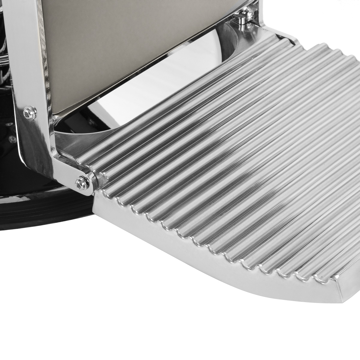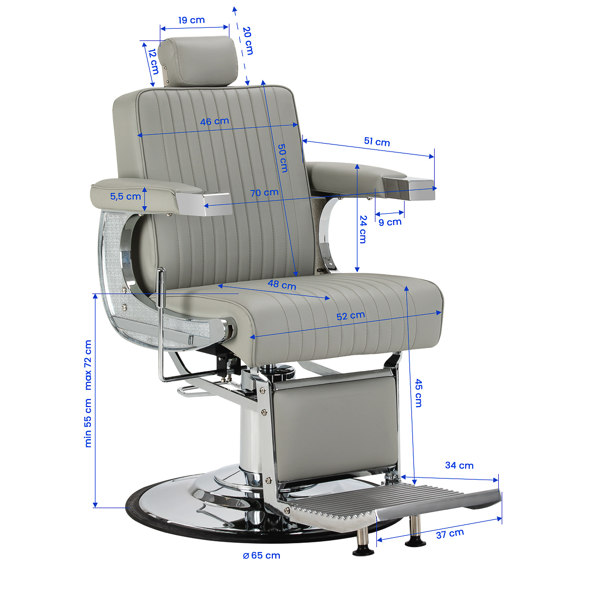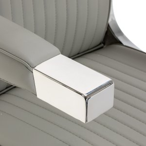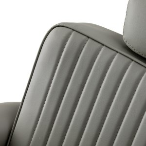 Solidna konstrukcja podstawy zapewnia stabilność oraz wysoki komfort użytkowania. Siedzisko wypełnione odporną na odkształcenia pianką oraz obite miękką, matową skórą syntetyczną łączy trwałość z komfortem. Materiały użyte do wykończenia są odporne na wilgoć, wytrzymałe i łatwe w czyszczeniu, co sprawia, że fotel doskonale sprawdza się w codziennej pracy. Stylowe przeszycia i tapicerka w odcieniach szarości nadają mu wyjątkowego charakteru, idealnie komponującego się z wystrojem nowoczesnych salonów barberskich.