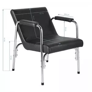 Opływowy profil nadaje meblowi nowoczesny wygląd, a eleganckie elementy w odcieniach chromu podkreślają charakter. Przyjemne w dotyku obicie z wysokiej jakości skóry syntetycznej w odcieniach czerni oraz trwałej pianki, zapewniając wysoki komfort użytkowania. Wytrzymałe materiały gwarantują długotrwałą użyteczność fotela. Stosunkowo niewielka waga mebla sprawia, że łatwo go przestawić, co jest szczególnie przydatne podczas intensywnego dnia pracy w salonie fryzjerskim. Odpowiednie wyprofilowanie sprawia, że fotel spełni wymagania nawet najbardziej wymagających klientów.