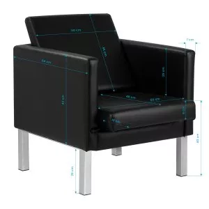 Fotel wykonany jest z trwałej, syntetycznej skóry w klasycznym, czarnym kolorze. Syntetyczna skóra jest łatwa do utrzymania w czystości, co pozwala na zachowanie idealnego wyglądu mebla przez długi czas. Dzięki wysokim nóżkom ułatwia utrzymanie porządku w salonie, umożliwiając łatwe sprzątanie przestrzeni pod nim.