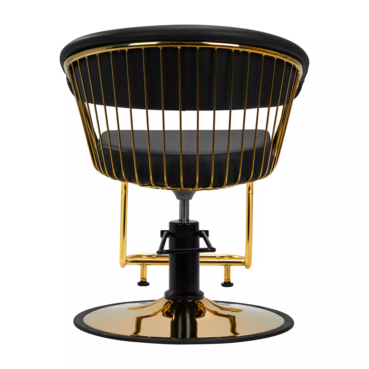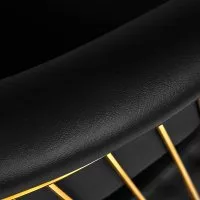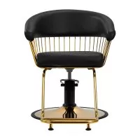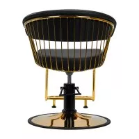 Trwały podnośnik hydrauliczny pozwala na regulację wysokości siedziska w granicach 48-55 cm, nawet w momencie, kiedy klient siedzi na fotelu. Gwarantuje to bardziej ergonomiczną pracę, dzięki możliwości swobodnego dostosowania poziomu fotela do wzrostu zarówno klienta, jak i fryzjera oraz opcji pełnego obrotu. Doskonale wyprofilowane oparcie obite skórą syntetyczną pozwala na zajęcie dogodnej pozycji. Zapewnia to odpowiednie wsparcie dla pleców, co ma znaczenie zwłaszcza w przypadku zabiegów trwających wiele godzin. Ciekawym wizualnie elementem jest tutaj metalowy, polerowany finezyjny detal w odcieniach złota łączący oparcie z siedziskiem. Powstałe przestrzenie ułatwiają zachowanie czystości w salonie, pozwalając łatwo wymieść włosy z każdego zakamarka fotela. Oszczędza się w ten sposób czas przygotowania stanowiska pracy pomiędzy klientami.