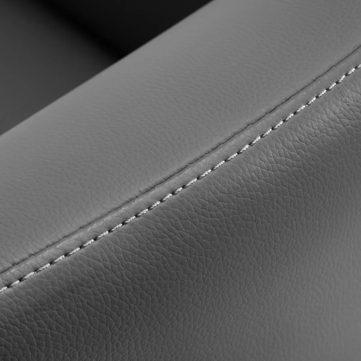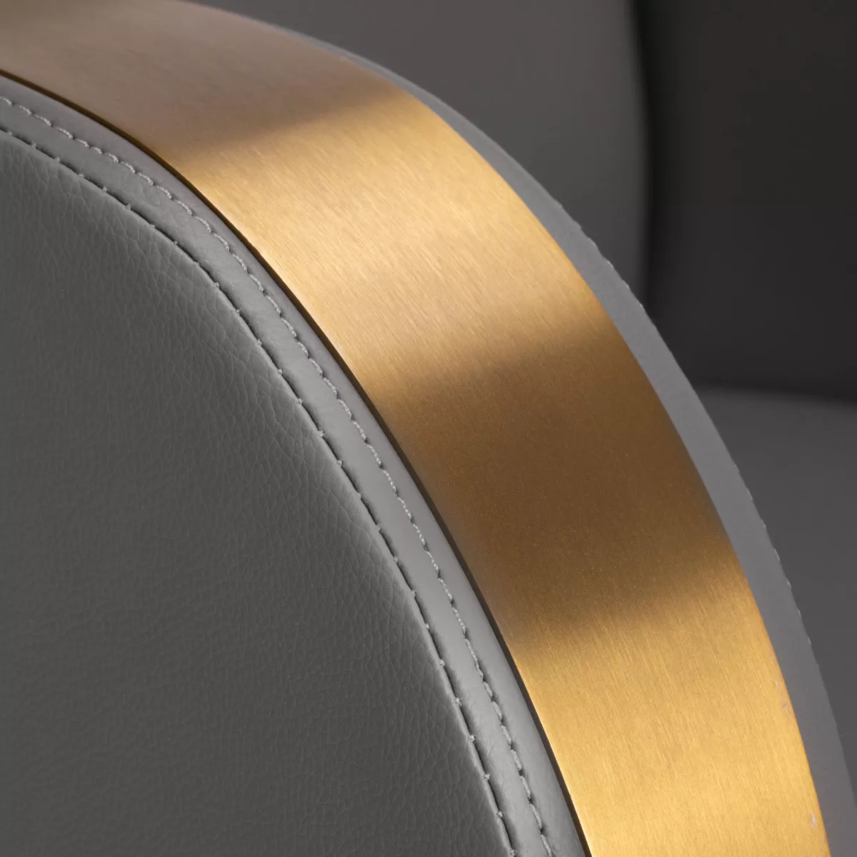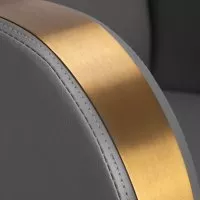 Fotel wypełniony jest pianką, która jest trwała i nie odkształca się, zapewniając komfortowe użytkowanie przez długi czas. Obicie wykonane jest z przyjemnej w dotyku imitacji skóry o specyficznej strukturze. Dzięki użyciu takiego materiału, sprzęt jest odporny na wilgoć, wytrzymały i łatwy w czyszczeniu. Pokrycie w odcieniach szarości oraz ozdobne powierzchnie metalowe lakierowane w barwach złota nadają mu wyraz ponadczasowej elegancji. Wyróżniające go klasyczne wykończenie sprawia, że będzie doskonale prezentować się w niemal każdej przestrzeni.