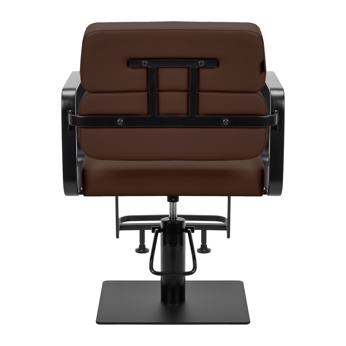 Mechanizm pełnego obrotu, w który jest wyposażony fotel, sprawia, że praca fryzjera staje się bardziej efektywna i wygodna. Solidna, płaska podstawa w kształcie kwadratu gwarantuje stabilność w trakcie użytkowania. Matowo wykończona, gładka powierzchnia nadaje elementowi elegancki wygląd i sprawia, że ten jest łatwy do utrzymania w czystości. Wygodne siedzisko z wypełnieniem z pianki zapewnia wysoki komfort użytkowania, nawet podczas wielogodzinnych zabiegów. Geometryczne, metalowe podłokietniki pozwalają na prawidłowe ułożenie barków klienta – sprawia to, że nie chowa głowy w ramionach ani się nie garbi – co wyraźnie ułatwia wykonywanie precyzyjnych zabiegów, w tym strzyżenia. Dedykowany do tego modelu stylowy podnóżek zapewnia stabilne oparcie dla stóp użytkownika.