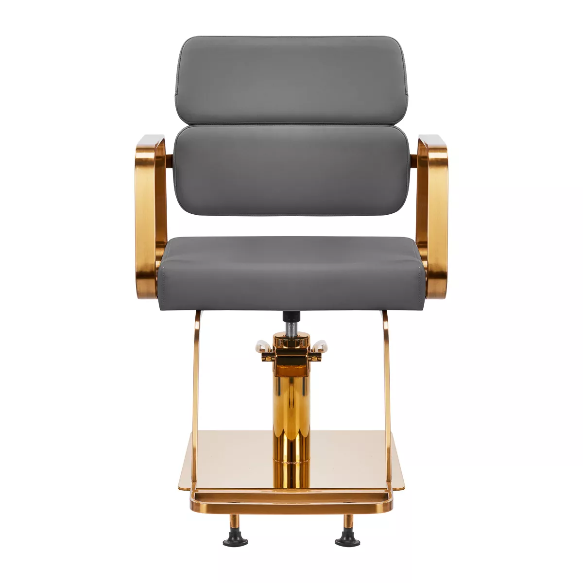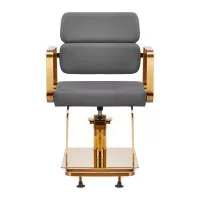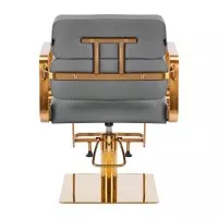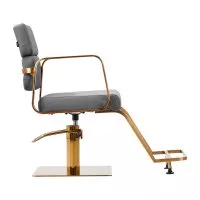 Mechanizm pełnego obrotu, w który jest wyposażony fotel, sprawia, że praca fryzjera staje się bardziej efektywna i wygodna. Solidna, płaska podstawa w kształcie kwadratu gwarantuje stabilność w trakcie użytkowania. Matowo wykończona, gładka powierzchnia nadaje elementowi elegancki wygląd i sprawia, że ten jest łatwy do utrzymania w czystości. Wygodne siedzisko z wypełnieniem z pianki zapewnia wysoki komfort użytkowania, nawet podczas wielogodzinnych zabiegów. Geometryczne, metalowe podłokietniki w odcieniach złota pozwalają na prawidłowe ułożenie barków klienta – sprawia to, że nie chowa głowy w ramionach ani się nie garbi – co wyraźnie ułatwia wykonywanie precyzyjnych zabiegów, w tym strzyżenia. Dedykowany do tego modelu stylowy podnóżek zapewnia stabilne oparcie dla stóp użytkownika.
