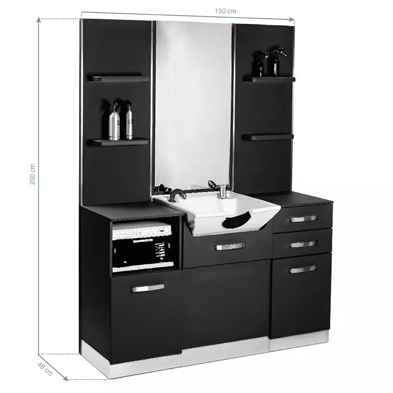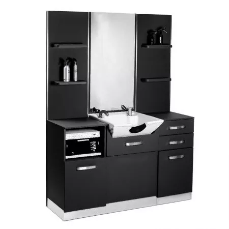 Odkryj nowoczesność i elegancję dzięki Gabbiano konsoli fryzjerskiej z umywalką B085 w kolorze czarnym. To wyjątkowy mebel, który doskonale łączy funkcjonalność z estetyką, stając się nieodłącznym elementem każdego profesjonalnego salonu fryzjerskiego.