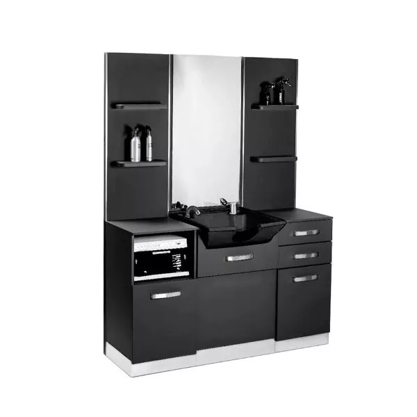 Odkryj nowoczesną elegancję i funkcjonalność dzięki konsoli fryzjerskiej Gabbiano z umywalką B085B w kolorze czarnym. To wyjątkowy mebel, który łączy w sobie styl i praktyczność, idealnie wpisując się w estetykę każdego salonu fryzjerskiego.