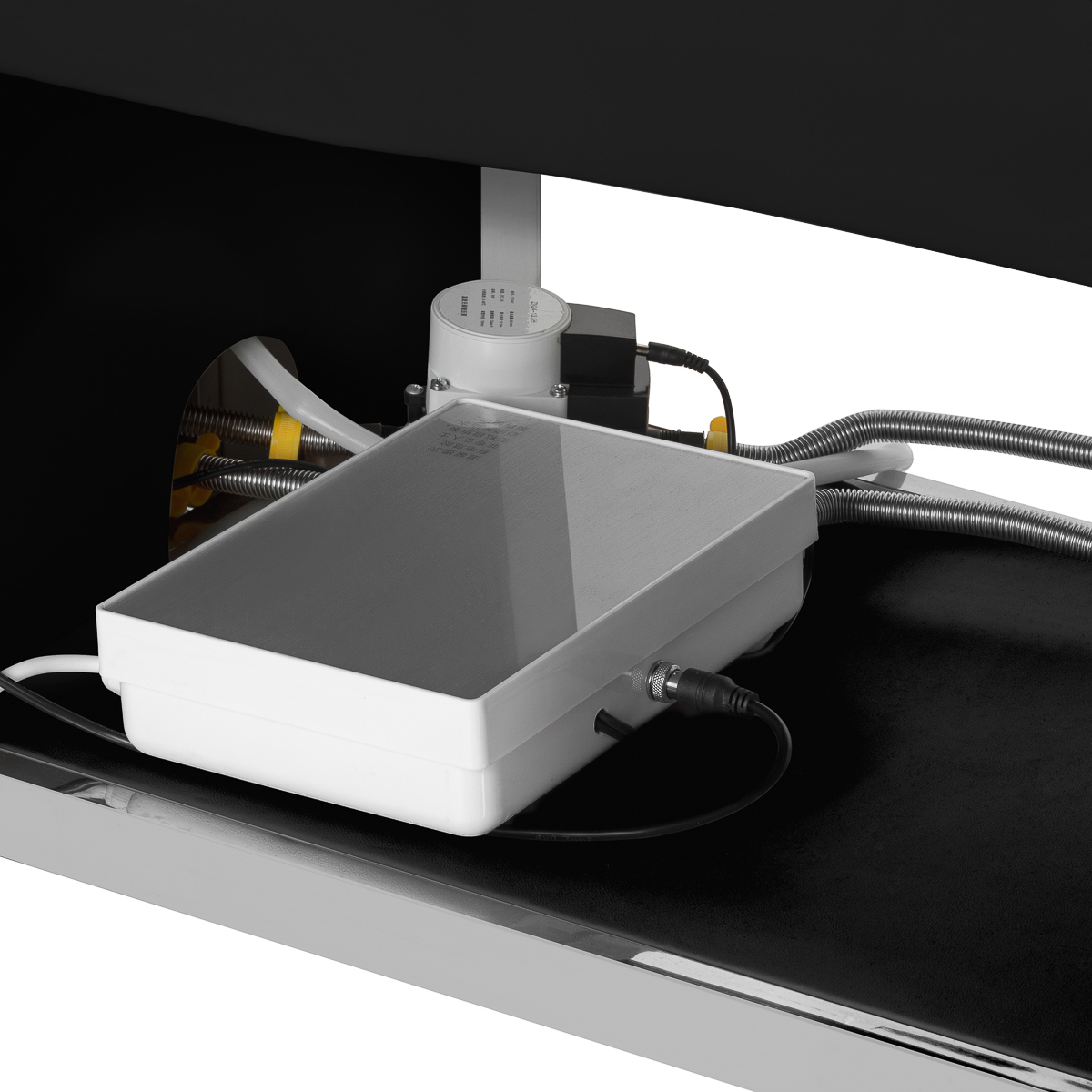Myjnia jest wyposażona w baterię z mieszaczem, co umożliwia łatwe dopasowanie temperatury do preferencji klienta. Dedykowane miejsce na słuchawkę natryskową ułatwia pracę, a chromowany korek ze specjalnym sitkiem pozwala na kontrolę przepływu wody oraz utrzymanie wysokich standardów higieny w salonie. Przyłącze wody umieszczono wewnątrz podstawy, co pozwala na sprawne ukrycie wszelkich rur. Leżankę wyprofilowano w taki sposób, by zapewniała wygodę podczas wykonywania różnorodnych zabiegów. Połączenie funkcjonalności i udogodnień sprawia, że praca w salonie fryzjerskim czy gabinecie SPA jest jeszcze bardziej komfortowa. W zestawie znajduje się również wygodna pufa, która zapewnia komfort pracy personelu, co czyni myjnię jeszcze bardziej wszechstronnym rozwiązaniem dla salonów SPA.