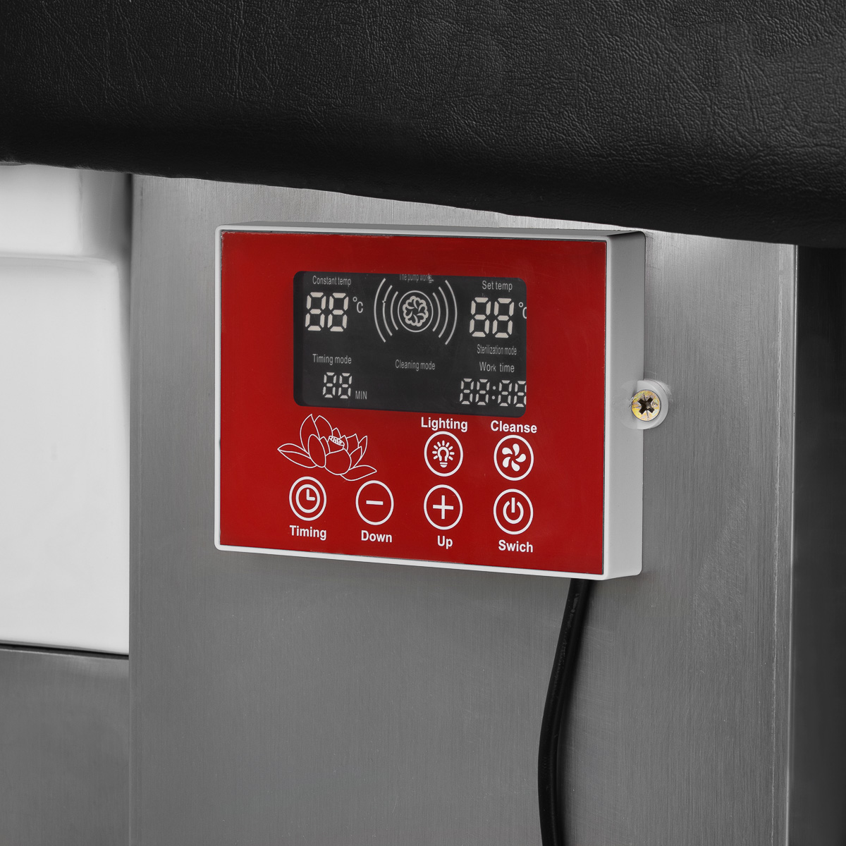 Intuicyjny panel dotykowy umożliwia pełną kontrolę nad parametrami zabiegu, zapewniając wygodę użytkowania. Umożliwia regulację czasu pracy oraz temperatury wody, a także monitorowanie ich aktualnych wartości. Dzięki wbudowanemu wyświetlaczowi możesz w każdej chwili sprawdzić, ile czasu urządzenie już pracuje. Panel pozwala również na włączenie funkcji światłoterapii, czyli podświetlenia misy, tworząc atmosferę relaksu i luksusu. Dodatkowo, urządzenie do terapii parowej wyposażone jest w pilota umożliwiającego wygodną obsługę na odległość.