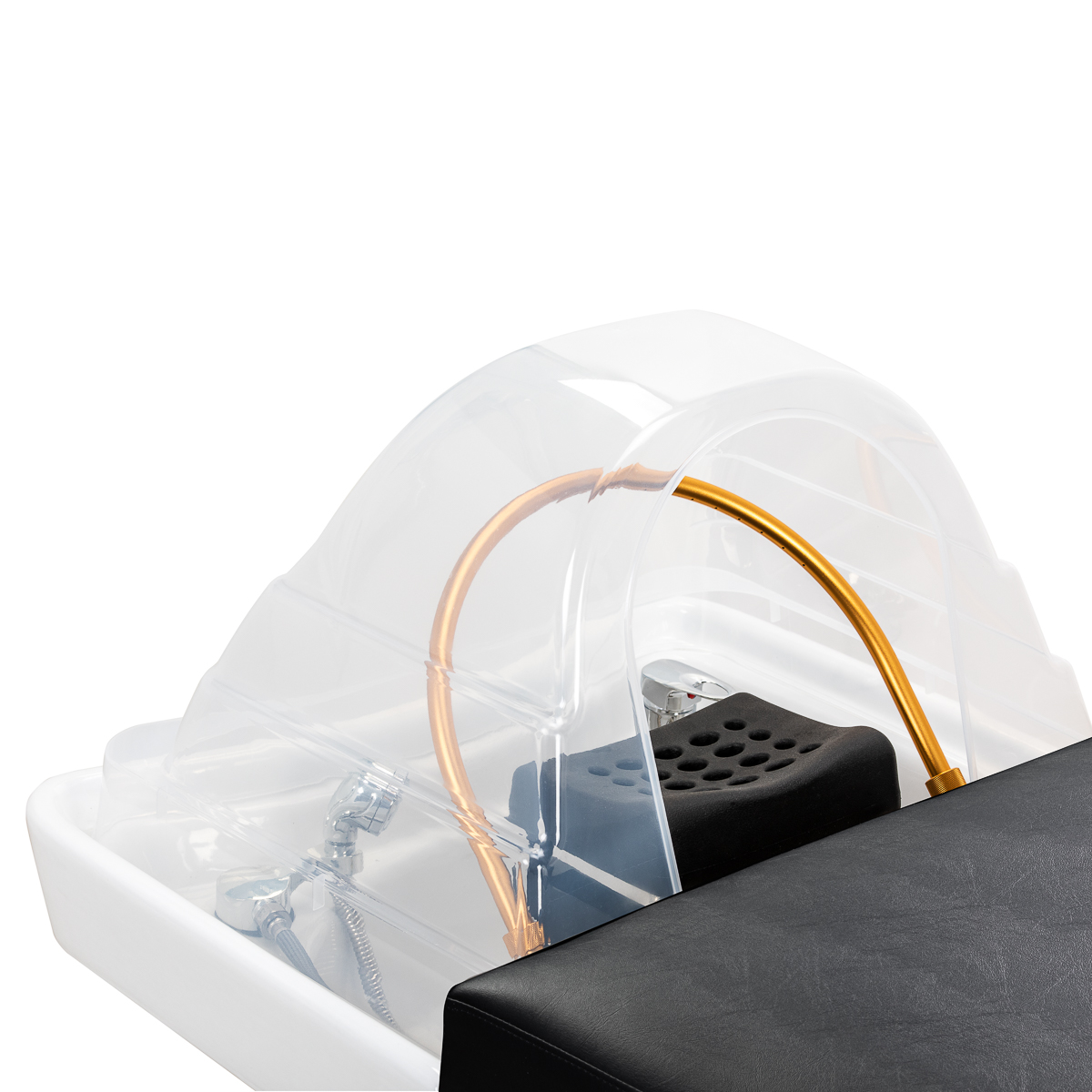 Regulowany podgłówek z możliwością wysuwania i zmiany kąta nachylenia zapewnia idealne dopasowanie do potrzeb użytkownika, zwiększając komfort podczas zabiegów. W zestawie znajdują się ergonomiczne poduszki, w tym zagłówek z otworem na twarz, który umożliwia wykonywanie nie tylko procedur pielęgnacyjnych skóry głowy, ale również masaży oraz różnorodnych zabiegów na ciało i twarz. Wbudowany brodzik poszerza funkcjonalność leżanki, umożliwiając przeprowadzanie zabiegów pielęgnacyjnych stóp, w tym pedicure. To rozwiązanie dodatkowo wzmacnia poczucie relaksu i pozwala na jeszcze bardziej kompleksową ofertę usług. Dzięki tym praktycznym elementom leżanka staje się uniwersalnym wyposażeniem salonów beauty & wellness, gwarantując zarówno wygodę klienta, jak i efektywność wykonywanych zabiegów.