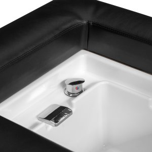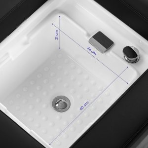 Myjnia jest wyposażona w baterię z mieszaczem, co umożliwia łatwe dopasowanie temperatury do preferencji klienta. Praktyczne miejsce na słuchawkę natryskową ułatwia pracę, a korek ze specjalnym sitkiem pozwala na kontrolę przepływu wody oraz utrzymanie wysokich standardów higieny w salonie. Przyłącze wody umieszczono wewnątrz pod misą oraz z tyłu pod brodzikiem, co pozwala estetycznie ukryć instalacje. Ergonomicznie wyprofilowana leżanka zapewnia wygodę i odpowiednie podparcie podczas zabiegów, a dołączona do zestawu pufa zwiększa komfort pracy personelu. Połączenie funkcjonalności i udogodnień sprawia, że myjnia staje się wszechstronnym wyposażeniem zarówno salonów fryzjerskich, jak i gabinetów SPA.