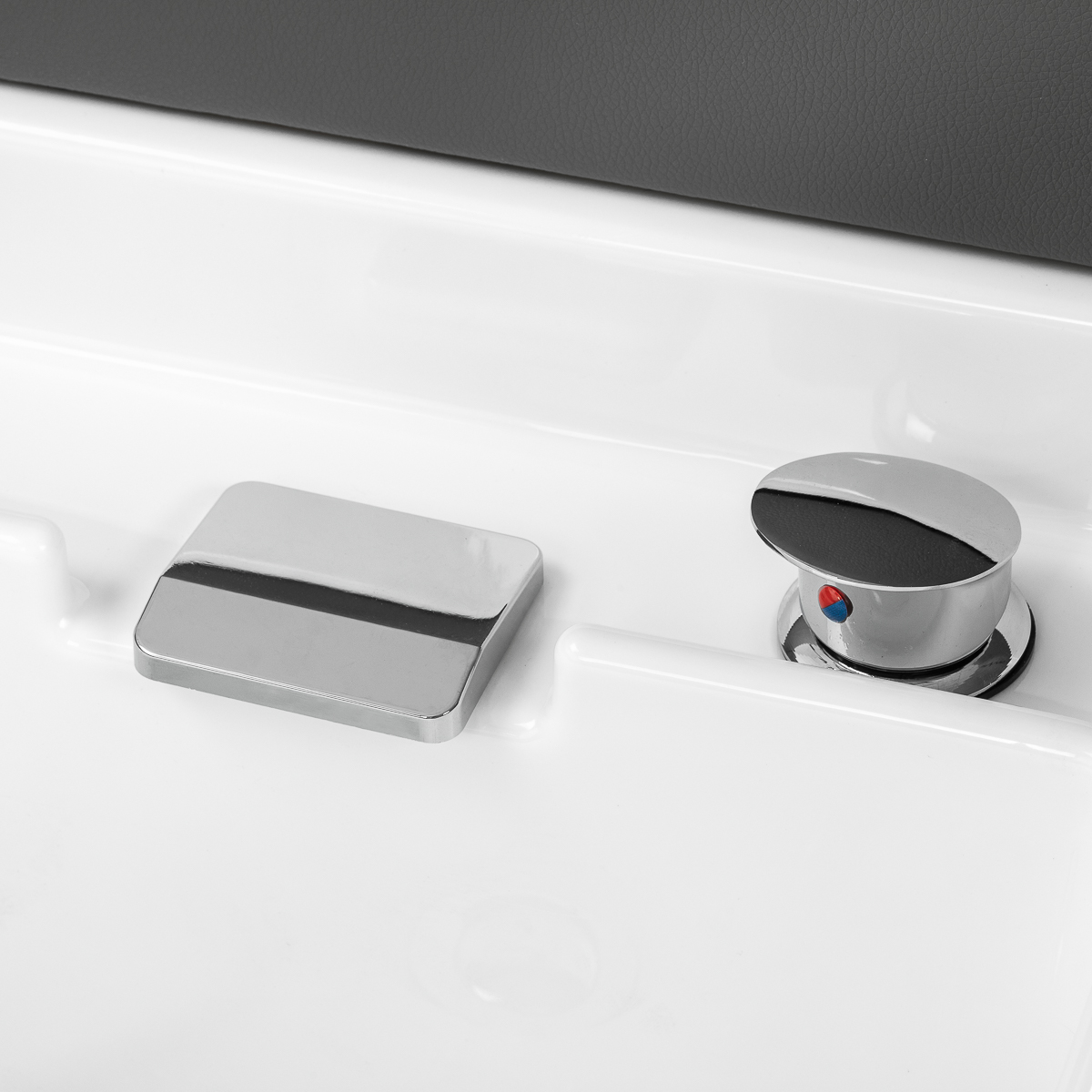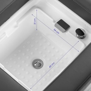 Myjnia jest wyposażona w baterię z mieszaczem, co umożliwia łatwe dopasowanie temperatury do preferencji klienta. Praktyczne miejsce na słuchawkę natryskową ułatwia pracę, a korek ze specjalnym sitkiem pozwala na kontrolę przepływu wody oraz utrzymanie wysokich standardów higieny w salonie. Przyłącze wody umieszczono wewnątrz pod misą oraz z tyłu pod brodzikiem, co pozwala estetycznie ukryć instalacje. Ergonomicznie wyprofilowana leżanka zapewnia wygodę i odpowiednie podparcie podczas zabiegów, a dołączona do zestawu pufa zwiększa komfort pracy personelu. Połączenie funkcjonalności i udogodnień sprawia, że myjnia staje się wszechstronnym wyposażeniem zarówno salonów fryzjerskich, jak i gabinetów SPA.