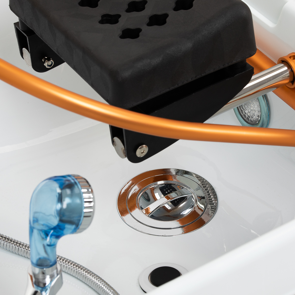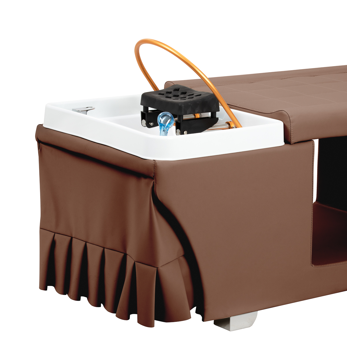 Myjnia została wyposażona w baterię z mieszaczem, umożliwiającą precyzyjne dopasowanie temperatury wody do potrzeb klienta. Dedykowane miejsce na słuchawkę natryskową usprawnia pracę, a chromowany korek ze specjalnym sitkiem zapewnia kontrolę przepływu wody i utrzymanie wysokiego poziomu higieny. Przyłącze wodne umieszczono wewnątrz podstawy za materiałem, co pozwala ukryć instalację i nadaje całości elegancki wygląd. Ergonomiczne wyprofilowanie leżanki gwarantuje komfort podczas różnych zabiegów pielęgnacyjnych. Całość dopełnia praktyczna pufa, zwiększająca wygodę pracy personelu i podnosząca funkcjonalność zestawu. Dzięki tym rozwiązaniom myjnia doskonale sprawdza się zarówno w salonach fryzjerskich, jak i gabinetach SPA.