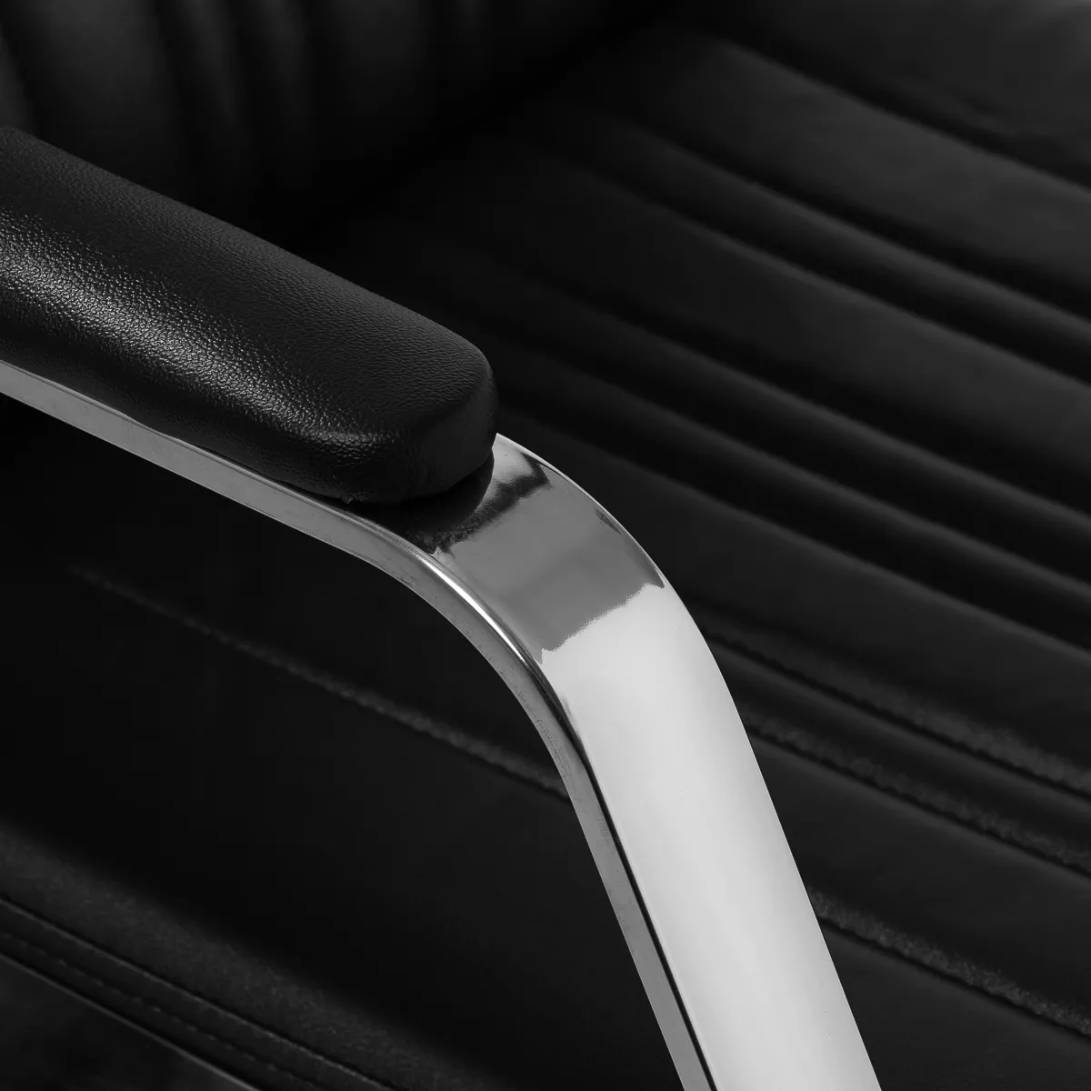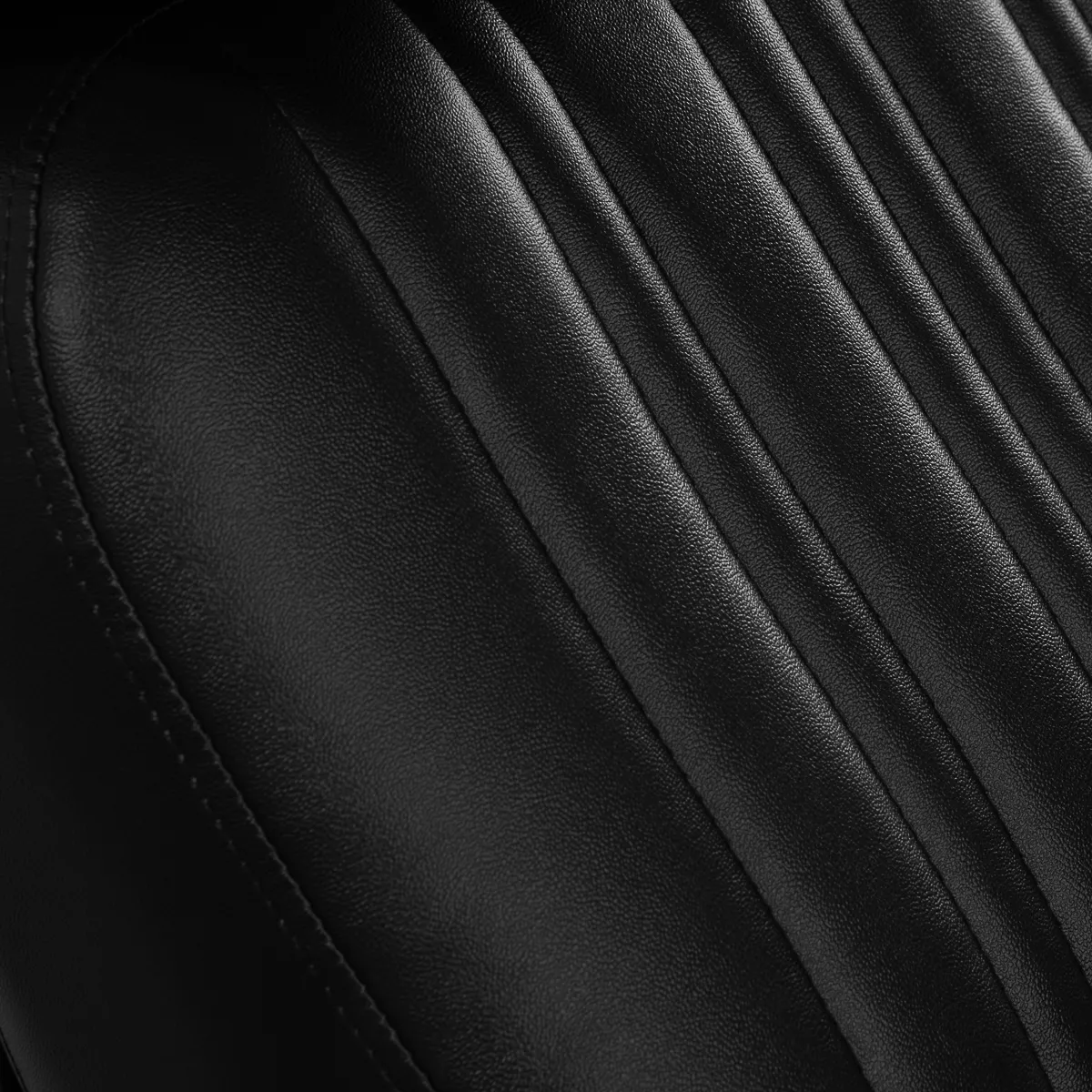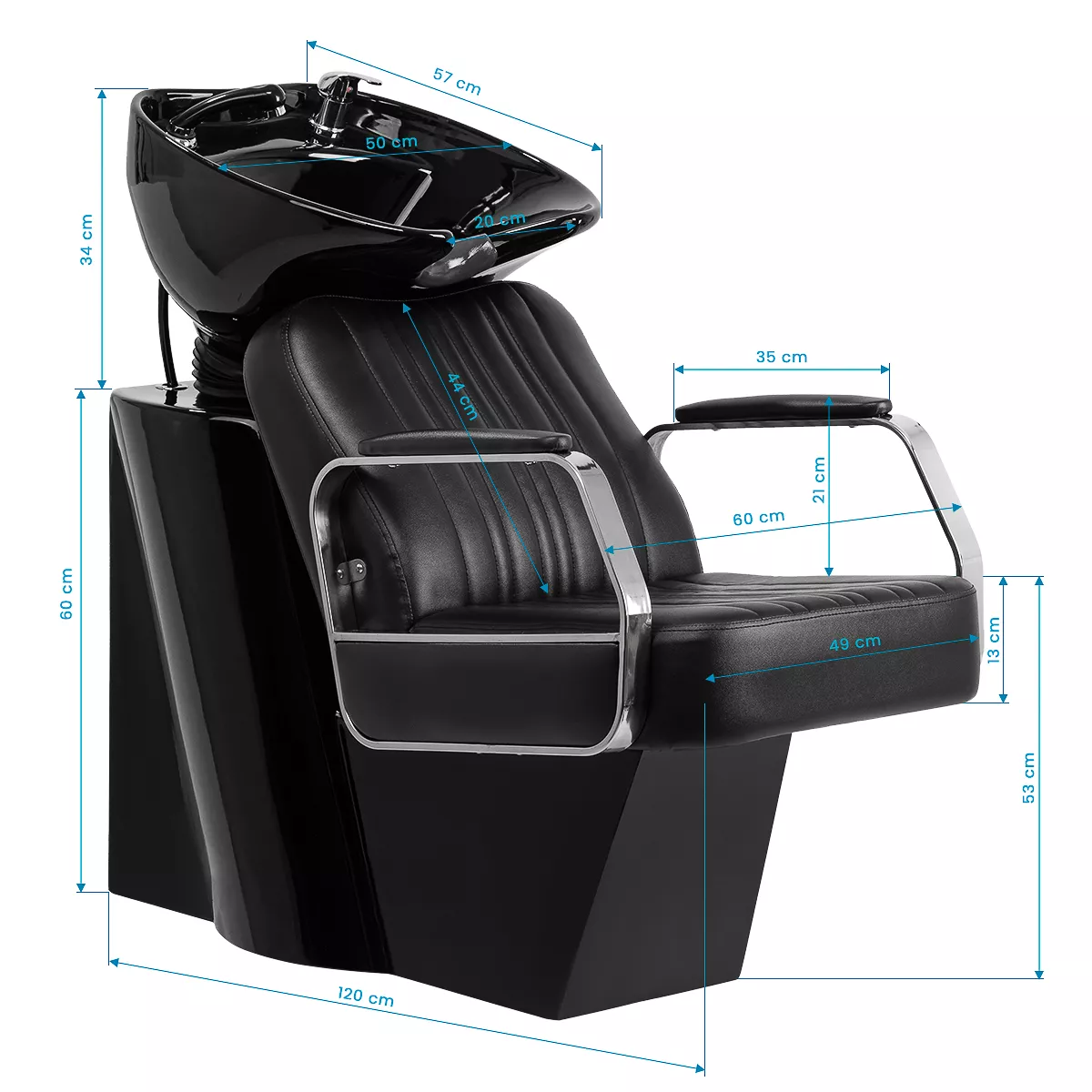 Wyprofilowany fotel wypełniony trwałą pianką zapewnia komfort użytkowania, a tapicerowane podłokietniki ułatwiają prawidłowe ułożenie barków klienta. Oparcie umieszczone pod optymalnym kątem sprzyja doskonałemu wsparciu kręgosłupa. Pokrycie ze skóry syntetycznej w odcieniach czerni gwarantuje wieloletnią wytrzymałość oraz łatwość czyszczenia. Stylowe przeszycia na tapicerce nadają myjni charakteru inspirowanego designem motoryzacyjnym, podkreślając jej efektowny wygląd. W zestawie znajduje się kompletna armatura w odcieniach chromu i czerni, w tym bateria, słuchawka prysznicowa oraz dedykowane węże, aby zapewnić całkowity zestaw narzędzi do pracy.